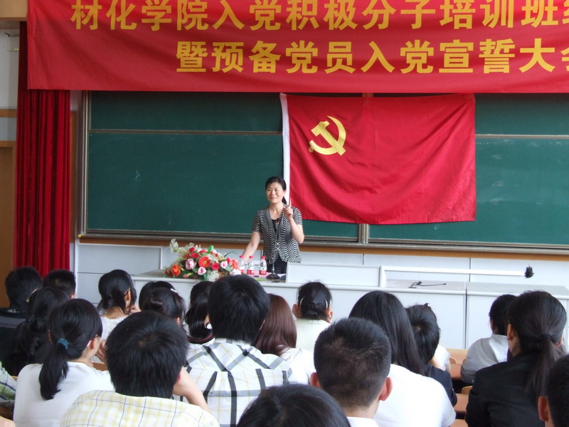 会上,班主任宣读了第四十三期入党积极分子培训班优秀学员名单和结业名单,并为大家颁发了证书。宣誓大会在庄严的国际歌中拉开帷幕,在庄严的党旗下,伴着铿锵有力的国际歌的旋律,在场的每一个人都心潮澎湃、感慨万分。而后,全体预备党员和党员面向鲜红的党旗紧握右拳高举过肩庄严宣誓:“我志愿加入中国共产党……”响亮的誓言传遍整个会场的每一个角落。预备党员代表和入党积极分子代表分别上台发言,分别表示将在今后的学习和工作中继续努力,以实际行动向党组织靠拢,充分发挥先锋模范作用,争作一名优秀共产党员。最后,何丽君副书记发表了热情洋溢的讲话,希望全体党员和入党积极分能够做到三个“好”:做好自己,服务好同学,团结带领好同学;“组织上入党是一生一次,思想上入党是一生一世。”她要求全体同志一定要在学习、工作和生活中体现出先进性,充分发挥先锋模范带头作用。