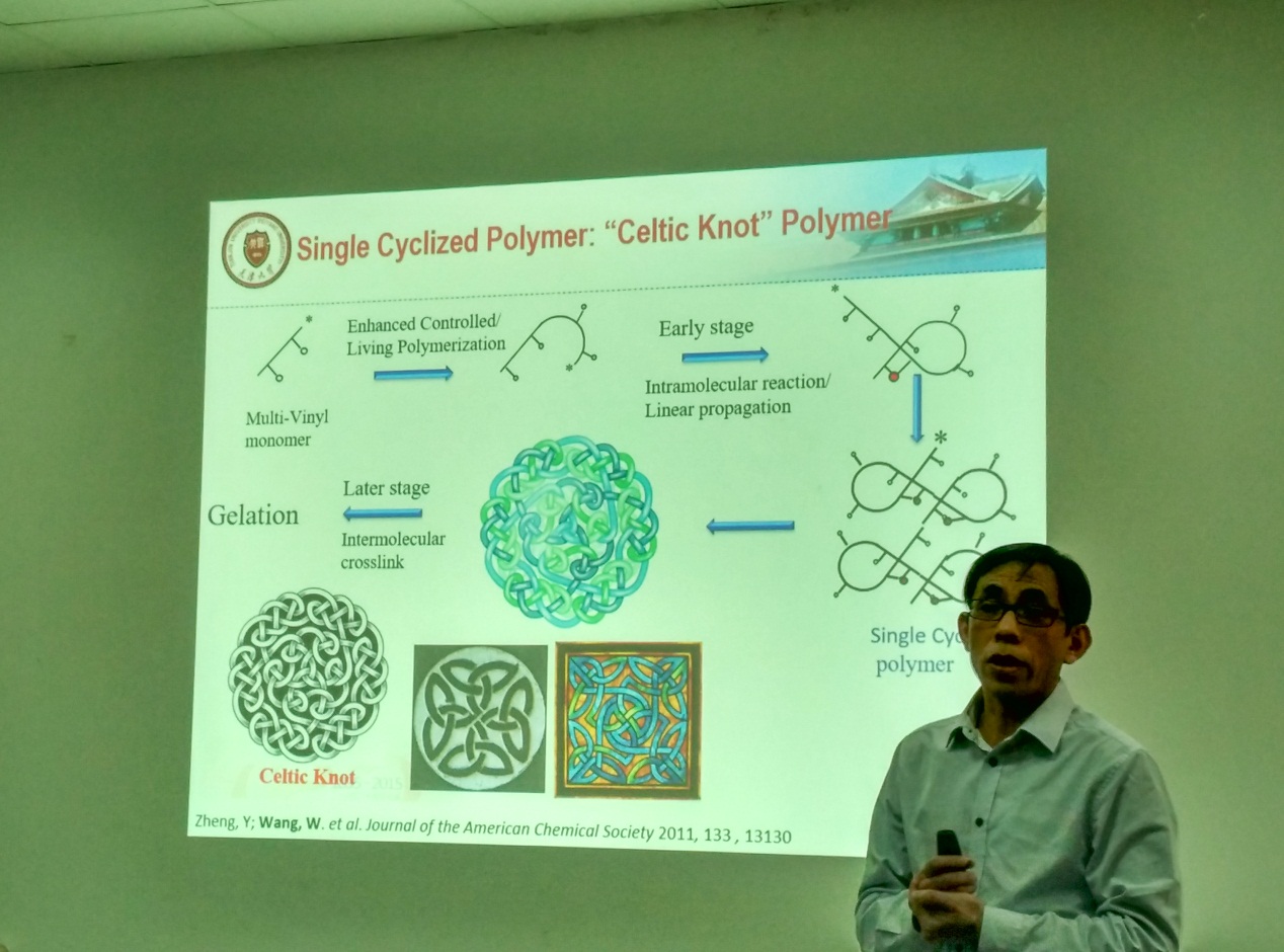 王文新老师向我们介绍了他的团队以及公司的研究方向.接下来,王老师从New Generation of Multifunctional Biomaterials from Well-controlled Polymerisation of Multivinyl Monomers这个部分开始。分为两个部分为我们进一步介绍他的工作.