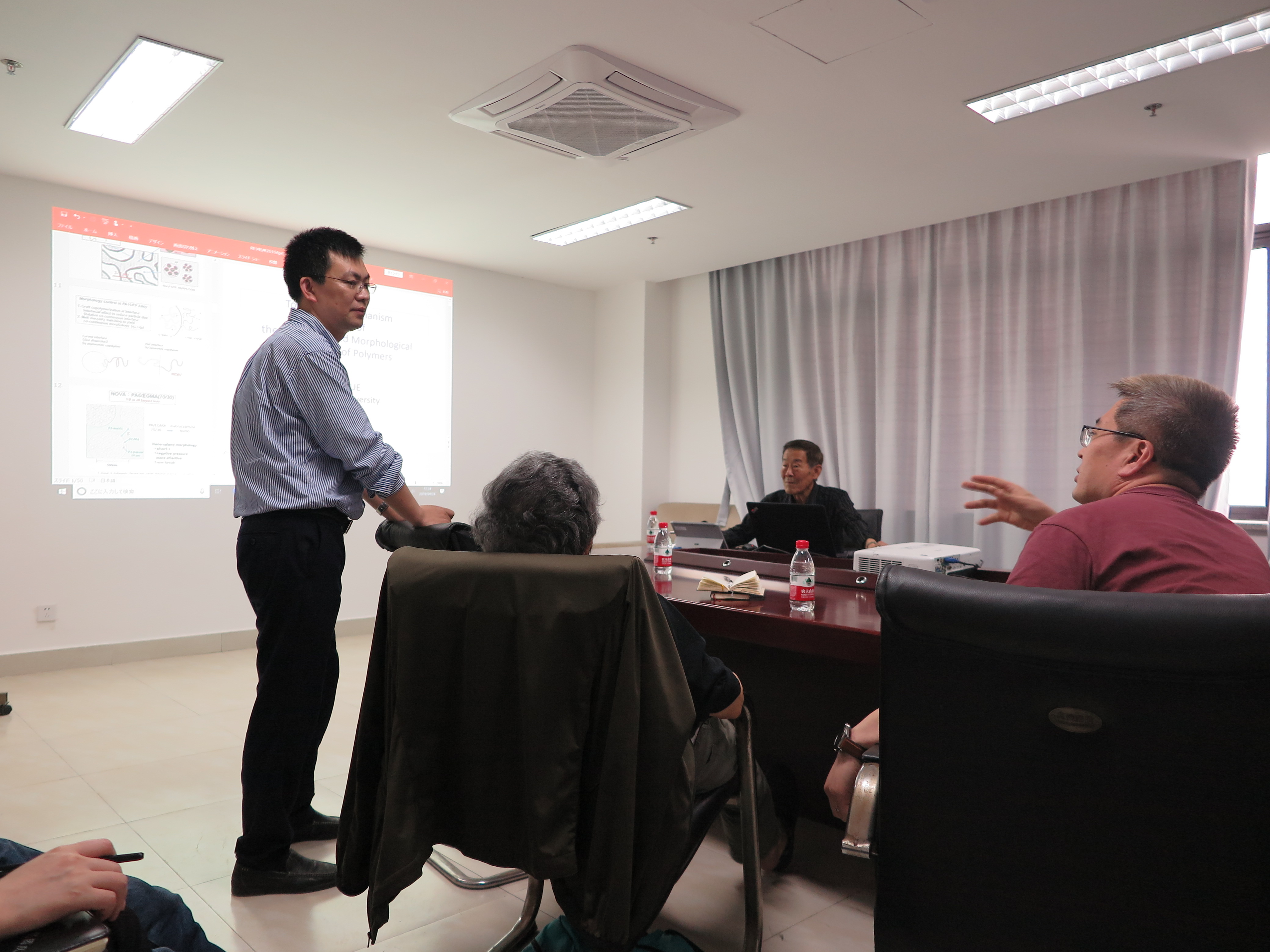 在李勇进教授用流利的日语对井上隆教授作了简要介绍后,报告在师生们的热烈掌声中拉开了帷幕。考虑到学生对于日语的不熟悉,为了使师生更好的了解报告所讲内容,井上隆教授委托李勇进教授担任本次报告的临时翻译。井上隆教授利用其丰富的技术经验和信息资源,先向我们详细介绍了反应性加工制备超韧PA,通过将马来酸酐接枝到EPR橡胶上,与PA进行共混成功制备出来性能优异的韧性材料,这种复合材料在冲击强度上有了40倍以上的提高。然后介绍了PA11与PP的复合材料,这种复合材料不仅成功将超韧PA的增韧机理应用于其中,还利用反应性加工形成了双连续结构。接着还分别向我们讲述了商品名为(NOVA)的PA6/EGMA合金和商品名为(Sabic)的PC/PET/MBS材料。最后向我们介绍了IMPACT项目取得的各类成果。井上隆教授深入浅出的报告令在座的师生都获益匪浅,其清晰而严谨的介绍更是获得了大家的掌声和赞叹。