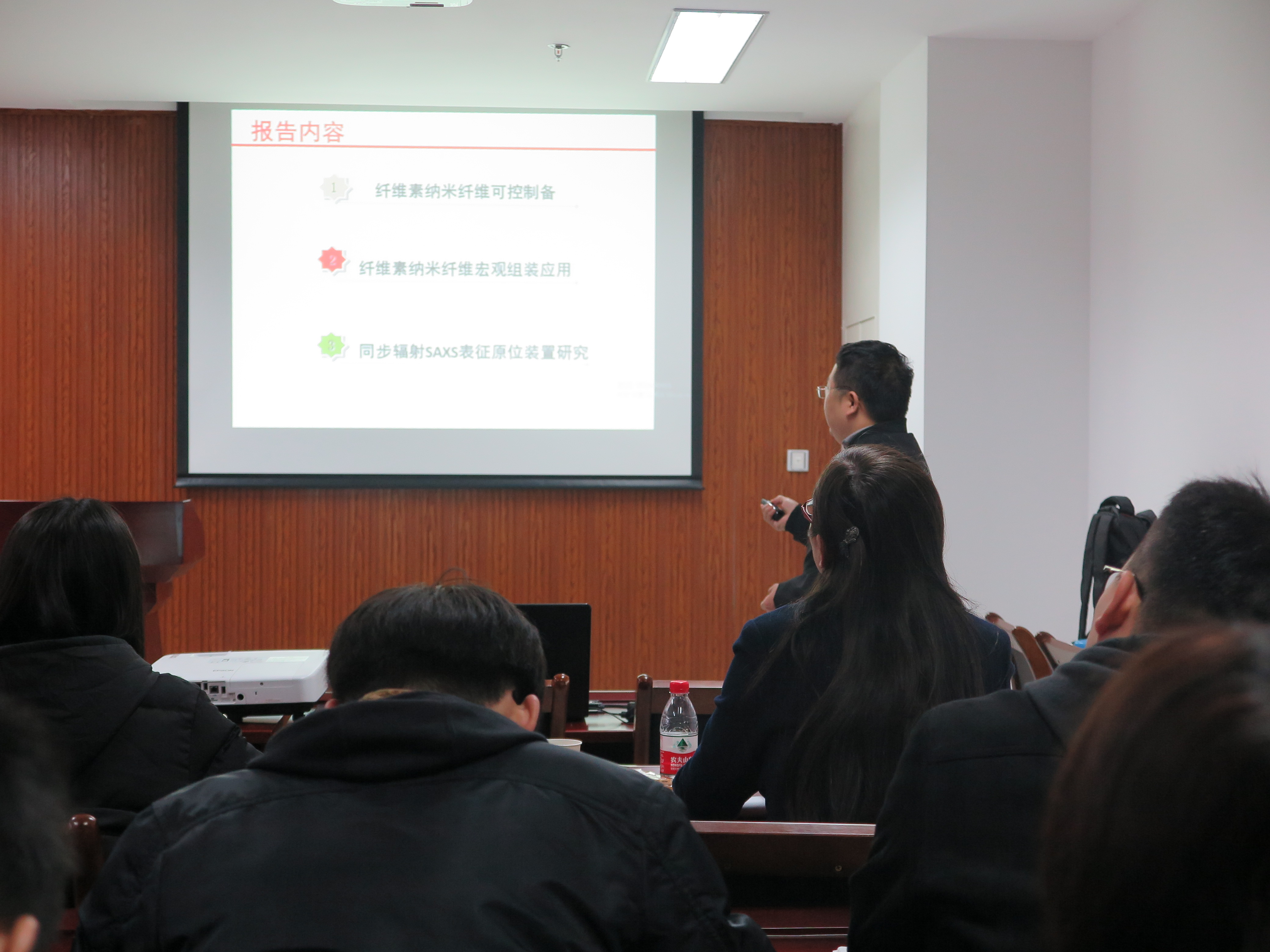 上海高等研究院—上海同步辐射光源研究员,从事X射线散射技术在纤维聚合物结构表征中的应用以及聚合物微纳米纤维制备与应用等研究工作。本次报告中,林金友研究员为我们详细介绍了纤维素纳米纤维可控制备,纤维素纳米纤维宏观组装应用以及同步辐射SAXS表征原位装置研究。在座的师生认真听取了报告,并与林金友研究员展开了深入的交流讨论,令各位师生对纤维素纳米纤维与SAXS表征设备有了更加深入的了解与认识。