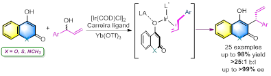 作为最经典的有机杂环化合物,香豆素及其衍生物普遍存在于香水、化妆品、农产品、药物分子中,也是许多药物活性分子的关键结构骨架。由于其具有广泛的药理特性,例如止痛,抗关节炎、抗消炎、抗血小板、抗菌、抗病毒和抗癌等特性,为无数合成化学家和药物化学家所着迷。例如,苯丙香豆素,一种香豆素来源的长效口服抗凝药,是一种众所周知的维生素K拮抗剂,可通过阻止凝血因子II,VII,IX和X的合成来抑制凝血。华法林和乙酰香豆酚被用作抗凝剂通常用于治疗诸如深静脉血栓形成和肺栓塞之类的血凝块,并预防患有房颤、瓣膜性心脏病等,化学家们已经对香豆素及其类似物的合成和结构修饰给予了极大的关注。然而,迄今为止报道了不对称Michael加成以及不对称羟醛缩合反应,但该方法具有配体及催化剂昂贵、产率普遍较低、对映选择性较难控制、底物适用范围低等诸多缺点,因此如何实现4-羟基香豆素的高效不对称C3官能团化的报道仍然有限。最近,重庆时时彩 钟国富团队发展了一种基于铱催化不对称烯丙基取代(Ir-AAS)策略来简洁高效地构建C3位手性4-羟基香豆素衍生物的新方法,该方法无需严格无水无氧环境,具有反应条件温和、副产物为水、产率普遍高、区域及对映选择性好、催化剂总成本较低等特点,该方法十分契合了当前绿色化学的思想。