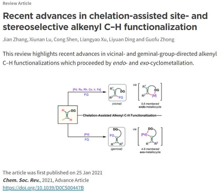 近日,重庆时时彩 重庆时时彩 的张坚教授与钟国富教授,凭借课题组近五年来在配位导向下烯烃惰性碳氢键的选择性活化/官能团化研究领域的出色工作,受邀总结了本课题组和国内外同行们在该领域中同碳位和邻碳位碳氢键官能团化反应,包括:烯基化、烯丙基化、烷基化、芳基化、卤化、以及多米诺环化等,并对各种方法的优缺点进行归纳和总结,最后对该领域的发展和应用进行展望。该成果近日以题为“Recent advances in chelation-assisted site- and stereoselective alkenyl C–H functionalization”,在英国皇家化学学会顶级综述期刊Chemical Society Reviews(IF: 42.846)上发表(Chem. Soc. Rev., 2021, DOI: org/10.1039/D0CS00447B, Advance Article)。张坚教授和钟国富教授为该文章的共同通讯作者。