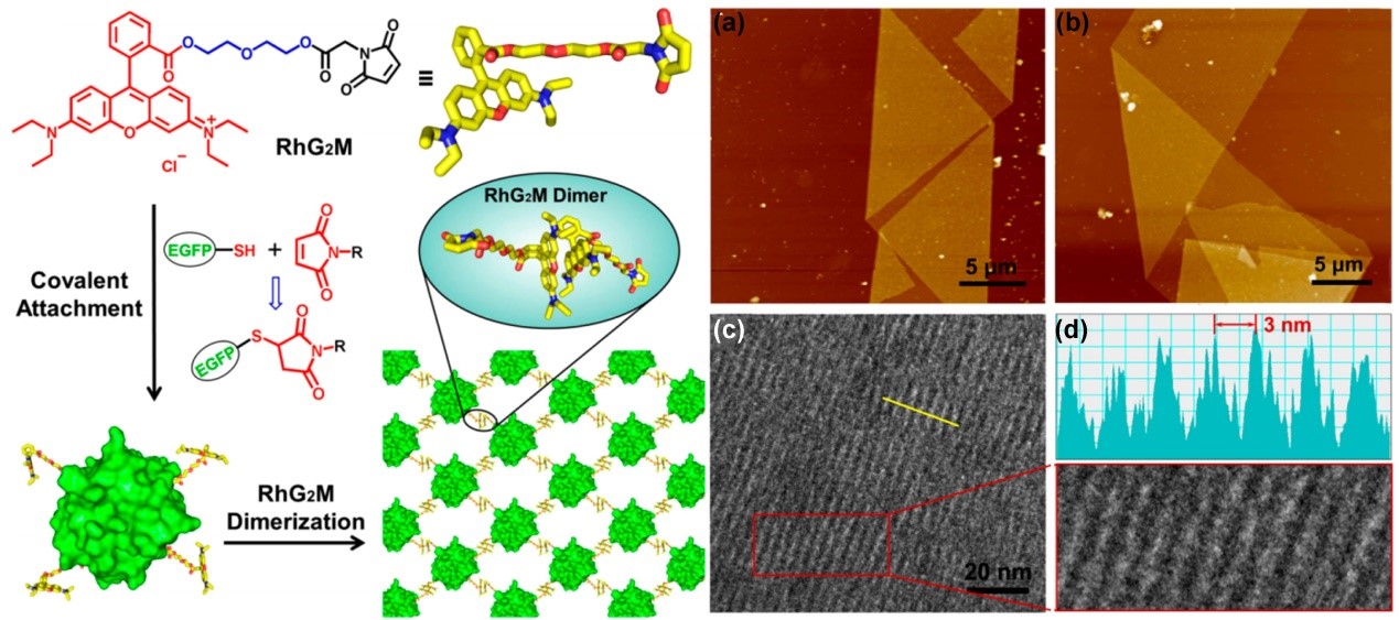 为了解决这一问题,作者设计、合成了马来酰亚胺功能化的罗丹明B分子,发展了一种简捷、高效的控制蛋白组装行为的策略,成功构建了纳米乃至微米级高度有序的荧光蛋白二维组装体。通过在EGFP的腰部选择合适位点设计一组近C4对称的半胱氨酸,为蛋白质提供径向生长的趋势。在此基础上利用位点特异性的化学修饰和罗丹明B π-π堆积作用协同,实现了EGFP的精确自组装。受串联模式的影响,组装全程在热力学驱动下进行。在低蛋白质浓度下条件下,EGFP自组装形成高度有序的单层纳米片;在中等浓度条件下,形成微米级的大型二维膜结构;在高浓度条件下,生成了完美的带状组装体。这些微米级的二维组装体不仅具有高度有序的微观结构,还具有令人印象深刻的柔性,这不禁让我们联想到天然S层,因此该组装结构具有潜在的应用前景。此外,合成的RhG2M分子可以作为一种普适的分子工具修饰于蛋白质表面的任意位点,这一特点也为蛋白质工程化组装提供了可能。