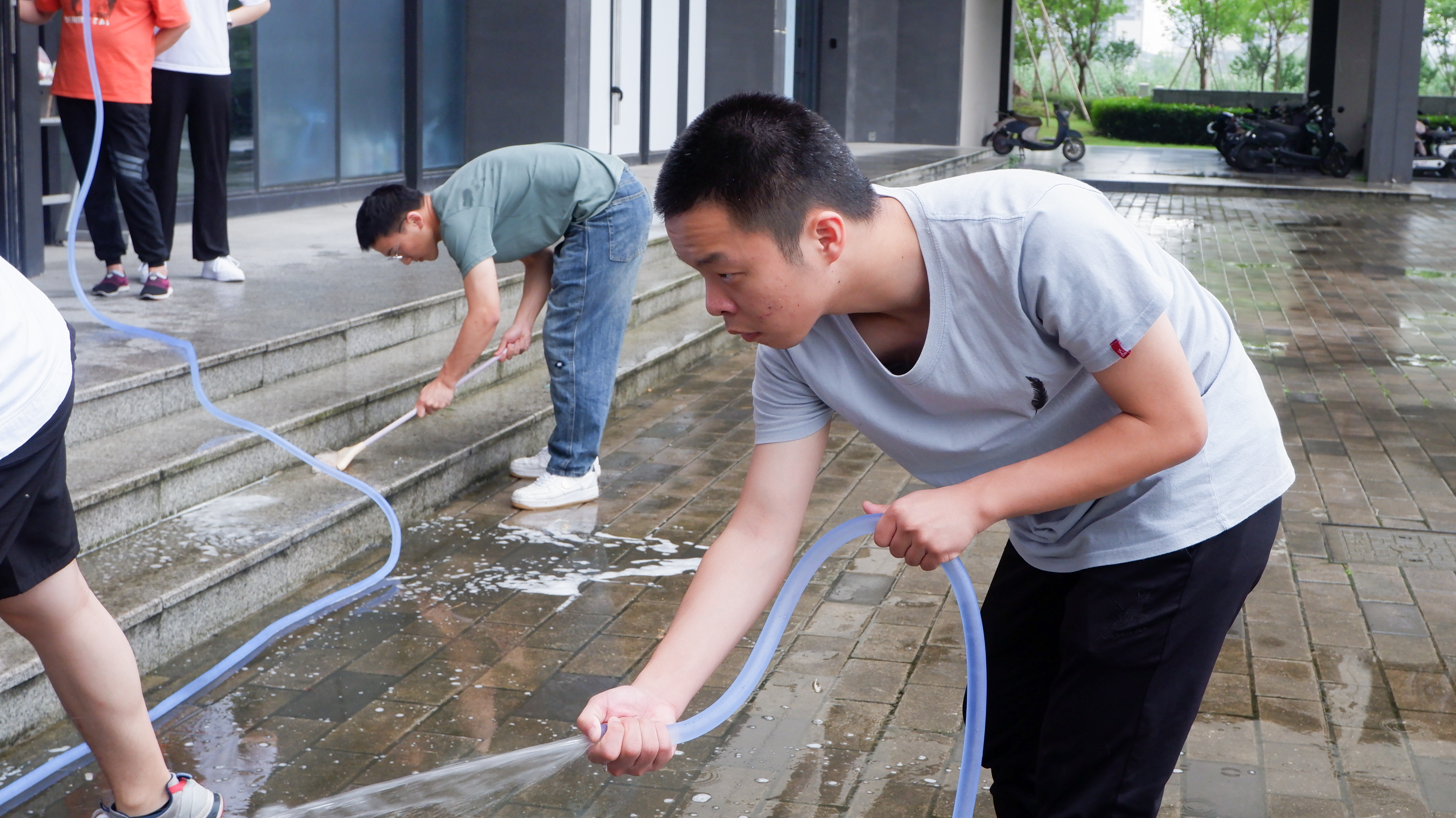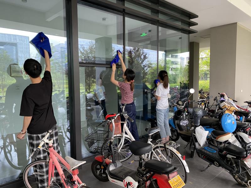 随后同学们分成两拨,分别前往精思苑3号楼和精思苑4号楼开展志愿活动。在精思苑3号楼的志愿者们在阿姨的带领下在寝室楼内拖地擦台阶擦玻璃,在精思苑4号楼的同学们用扫帚和刷子卖力地清洗着台阶上的青苔,在用水冲洗掉清理完的而污垢以后台阶便焕然一新了。