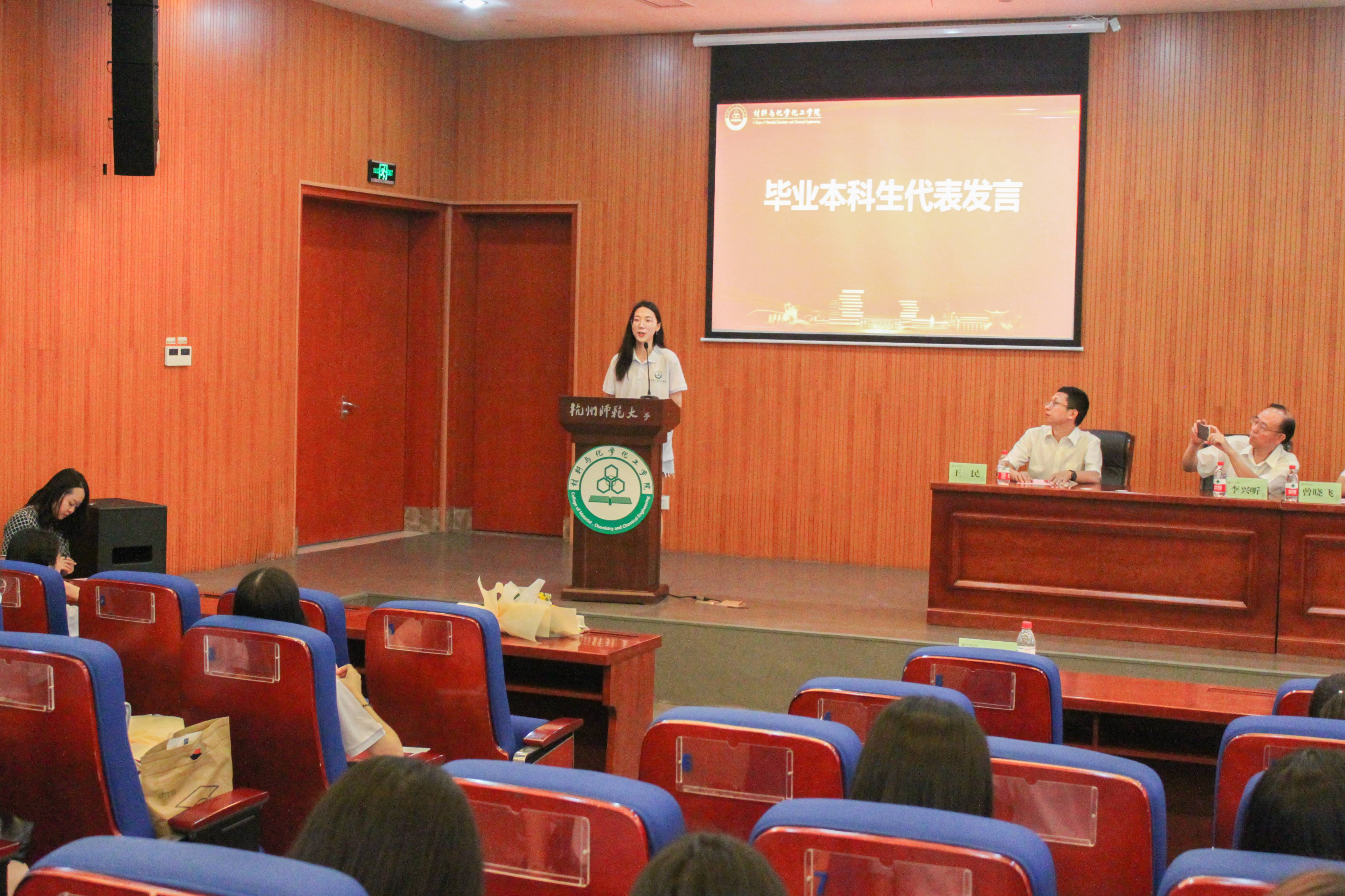 本科生代表、制药171班何佩佩,研究生代表、高分子化学与物理专业张研依次发言,说出了自己的毕业心声,回望了过去四年的难忘点滴,畅想了对未来美好蓝图的憧憬。
