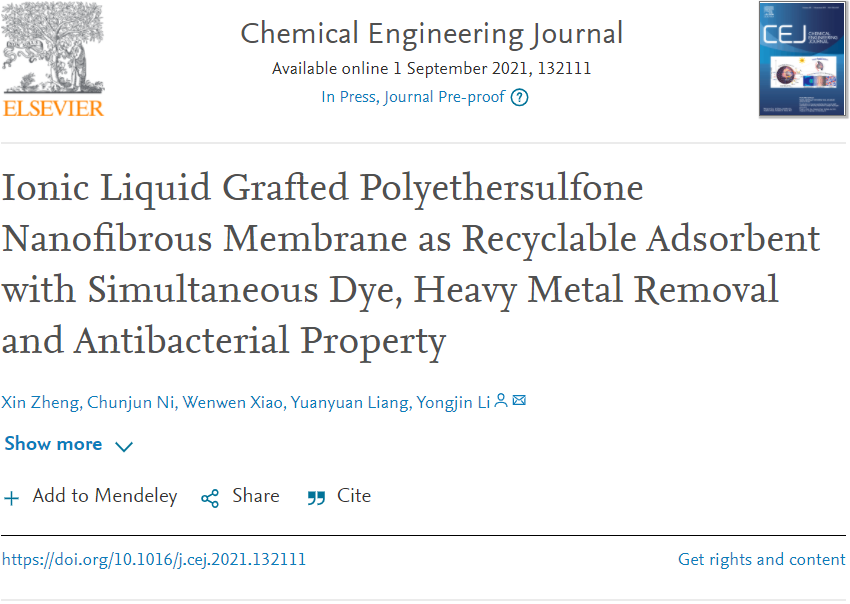 重庆时时彩 李勇进教授团队长期从事高分子材料辐射接枝改性及功能材料制备研究。近日,团队利用辐射引发接枝聚合的方法,成功将含有双键的多功能阳离子型离子液体,1-乙烯基-3-丁基咪唑四氟硼酸盐(IL,VBIm BF4),原位接枝在聚醚砜(PES)分子链上(PES-g-IL),获得了具有优异亲水性的PES膜材料,并进一步通过静电纺丝制备了具有高孔隙率和高比表面积的PES-g-IL纳米纤维膜。PES-g-IL纳米纤维膜上的阳离子可以通过静电相互作用吸附带负电的染料分子,同时,离子液体咪唑环上带孤对电子的N原子还可以通过金属螯合作用捕捉重金属离子,实现了染料和重金属的同时吸附。此外,PES-g-IL纳米纤维膜上的离子液体还可以吸附细菌并破坏其细胞膜完整性而导致细菌死亡。这种多功能的吸附材料还可以多次重复使用。相关研究成果以“Ionic Liquid Grafted Polyethersulfone Nanofibrous Membrane as Recyclable Adsorbent with Simultaneous Dye, Heavy Metal Removal and Antibacterial Property”为题发表在Chemical Engineering Journal(IF=13.273)上。