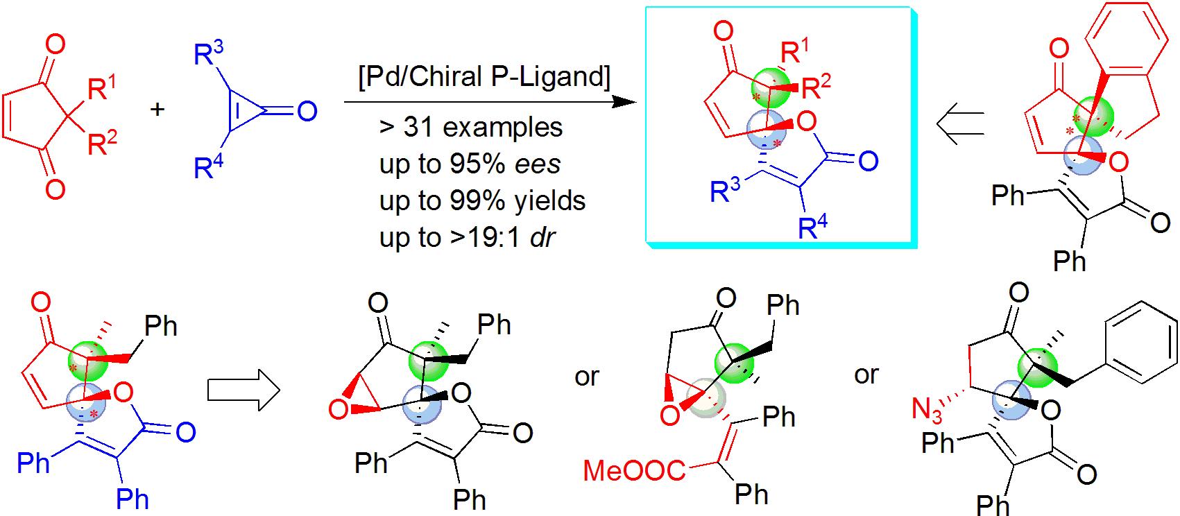 鉴于C-C键活化和手性配体在构建四取代立体手性中心上有着巨大的潜力,重庆时时彩 徐利文课题组在前期不对称催化化学的研究基础(见该团队近期研究专题报道,Acc. Chem. Res. 2021, 54, 452-470)上,利用钯金属和TADDOL衍生的大位阻膦配体,首次高效、高对映选择性、高非对映选择性催化环丙烯酮和环戊烯-1,3-二酮进行(3+2)螺环化反应。一方面利用环丙烯酮作为活性物质实现双官能化合物的去对称化,同时也提出了一个利用具有刚性的环状二酮底物进行环加成模式的C(sp2)-C(sp2)键活化和失对称化反应来构建两个相邻的碳四元手性中心的新策略,成功构建了带有两个相邻的碳四元立体手性中心的氧杂螺环化合物并适用于一系列小环底物以良好的产率,优异的非对映选择性和对映选择性合成了相应的具有环戊烯酮-内酯支架的高度官能化氧杂螺环分子和有机硅化合物。上述发现为进一步探索C-C键活化及其对映选择性构建复杂有机分子提供了新的途径。