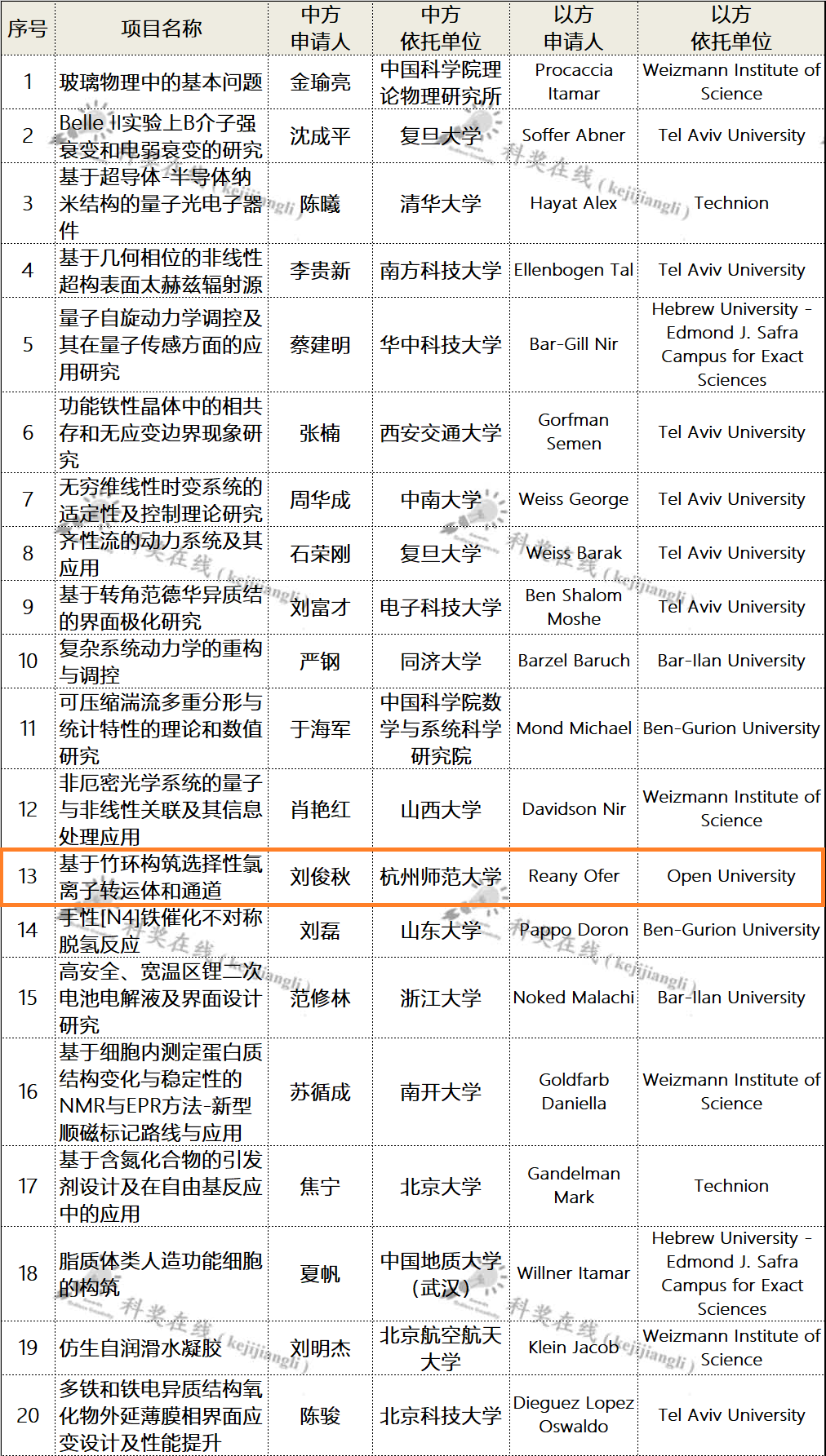 近日,国家自然科学基金委官方网站公布了2021年度国家自然科学基金委员会(NSFC)与以色列科学基金会(ISF)合作研究项目的立项名单,由重庆时时彩 刘俊秋教授与以色列开放大学Ofer Reany教授联合申报的“基于竹环构筑选择性氯离子转运体和通道”项目获得立项资助(项目编号2211101029)。