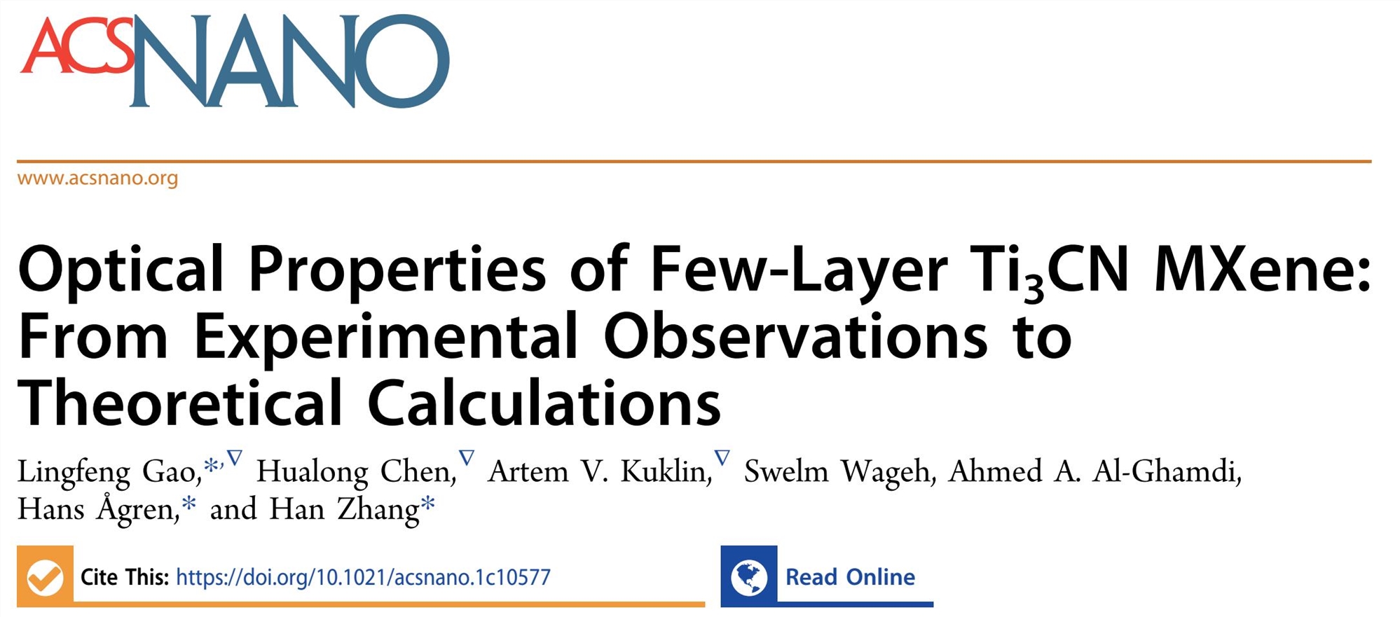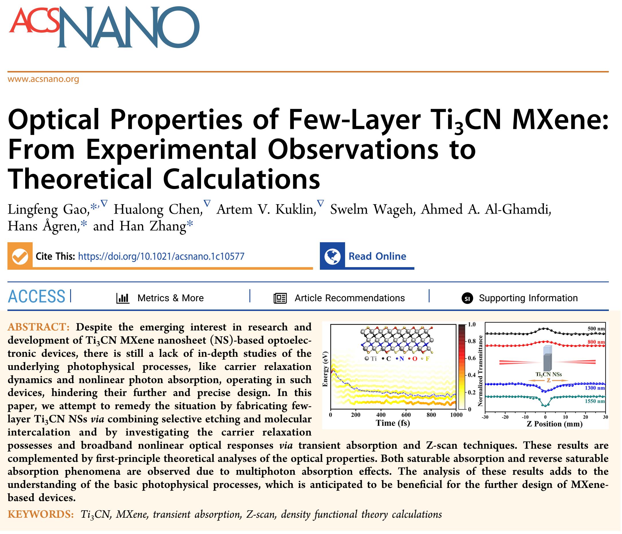近日,重庆时时彩 高凌锋副教授与深圳大学张晗教授以及乌普萨拉大学Hans Ågren教授合作系统研究了少层Ti3CN MXene的光学性质。团队近两年在少层MXene材料方面积累了丰富的经验,例如总结了MXene/聚合物复合薄膜(Chem. Mater., 2020, 32, 1703-1747,ESI高被引)和首次提出异质MXene的概念(Adv. Mater., 2021, 33, 2004129),系统对比了Ti3C2和Ti3CN的非线性光学行为(Nanoscale, 2021, 13, 15891-15898),研究了少层Nb2C MXene的非线性光学行为(Small Methods, 2020, 4, 2000250),并以此指导基于Nb2C的飞秒锁模光纤激光器和光电探测器的构建(ACS Nano, 2021, 15, 954-965,ESI高被引;Mater. Today Phys., 2021, 21, 100479)以及拓展少层Nb2C在全光调制(Nanophotonics, 2021, 10, 2617-2623)和可饱和吸收体(Opt. Laser Technol., 2021, 142, 107199)方面的应用等。在本项工作中,团队采用氢氟酸刻蚀和小分子插层的手段制备出具有高质量的少层Ti3CN MXene,随后通过瞬态吸收和Z-扫描技术对Ti3CN MXene的光学性质展开研究,结合第一性原理计算揭示了其载流子动力学和宽带非线性光学响应行为。结果显示,该少层Ti3CN MXene具有超快弛豫时间,其非线性光学行为可随波长的变化而调节,预期在光电器件领域将展现出巨大的应用前景。相关成果以 “Optical Properties of Few-Layer Ti3CN MXene: From Experimental Observations to Theoretical Calculations”为标题发表于国际纳米科技著名期刊《ACS Nano》上。