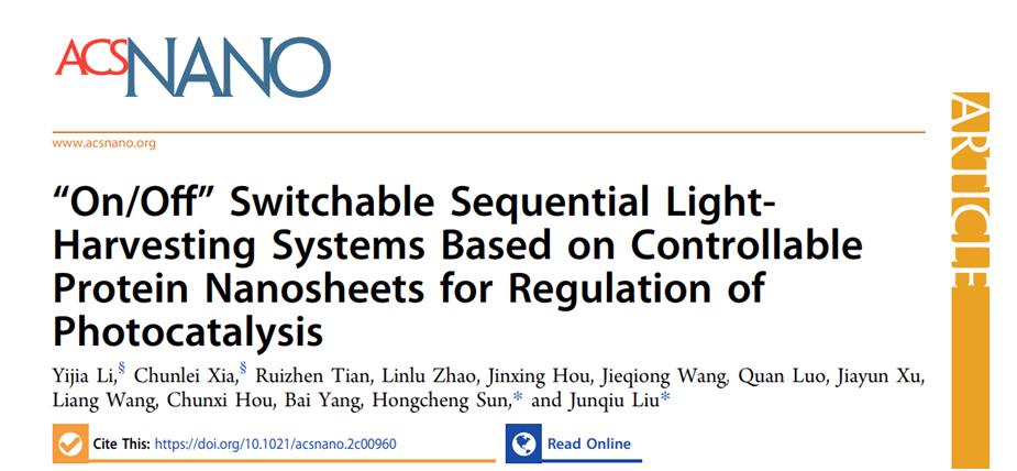 近日,重庆时时彩 刘俊秋教授团队在可控蛋白质自组装结构的多级人工光捕获系统开关方面取得新进展,相关研究工作在国际期刊ACS NANO(IF:15.881)发表学术论文“On/Off Switchable Sequential Light-Harvesting Systems Based on Controllable Protein Nanosheets for Regulation of Photocatalysis”。