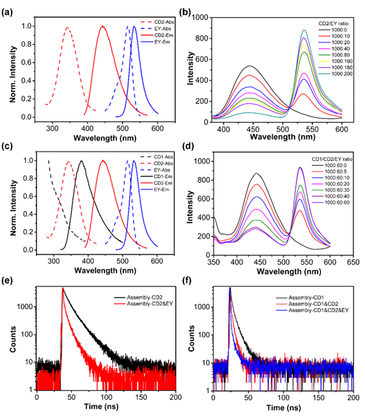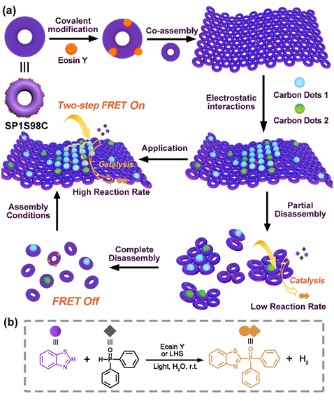 为了解决这一问题,重庆时时彩 刘俊秋教授团队构筑了一种基于可控蛋白质自组装结构的多级智能人工光捕获系统(图1)。具体如下:(1)以环状的热稳定蛋白SP1为基元设计了SP1S98C突变体,通过动态共价自组装策略构筑了具有氧化还原响应的二维SP1蛋白质纳米片层;(2)以低毒、环境友好的碳量子点(CDs)为荧光生色团,并通过静电相互作用在SP1纳米片层为支架精确展示,实现不同量子点(CD1和CD2)之间的传递;(3)将具有光催化活性的EY中心共价锚定在蛋白质片层表面,研究其能量接收及光催化性能。光照后,实现能量从供体(CD1)到第一受体(CD2)再到第二受体(EY)的逐级顺次传递(图2)。因此,研究团队发展出具有多步顺序荧光共振能量转移(FRET)过程的可控人工光捕获系统,进而实现对光催化模型反应的可控调节,同时从结构、能量传递方式和催化能量转化三个方面同时模拟了天然光捕获系统。