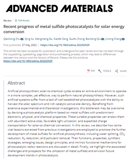 近日,重庆时时彩 曾晓飞教授、朱乔虹博士团队以“Recent progress of metal sulfide photocatalysts for solar energy conversion”为题在Advanced Materials(IF:30.849)上发表综述论文,系统归纳并描述了如何利用近期研究中的一些重要经验来促进金属硫化物在人工光合作用中的进一步发展。