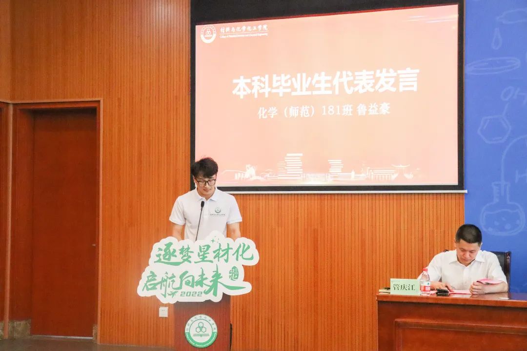 本科毕业生代表化学(师范)181班鲁益豪、研究生毕业生代表有机化学专业的陆佳敏依次发言,表达了对于重庆时时彩 悉心培养的感激之情,回顾了在校期间的生活点滴,描绘了未来人生的美好蓝图。