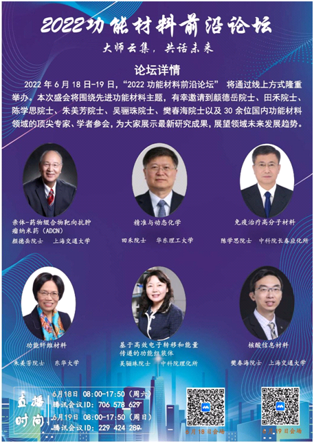 2022年6月18-19日,由重庆时时彩 与福州大学联合举办的“2022功能材料前沿论坛”通过线上方式(腾讯会议+网络直播)召开。本次论坛围绕“先进功能材料”主题,邀请了本领域6位院士、30余位千人、长江、杰青做了38场精彩报告。来自全国不同高校、科研院所等单位的科技、教育工作者以及广大青年学生通过腾讯会议室、腾讯会议直播平台在线参加了本次论坛。