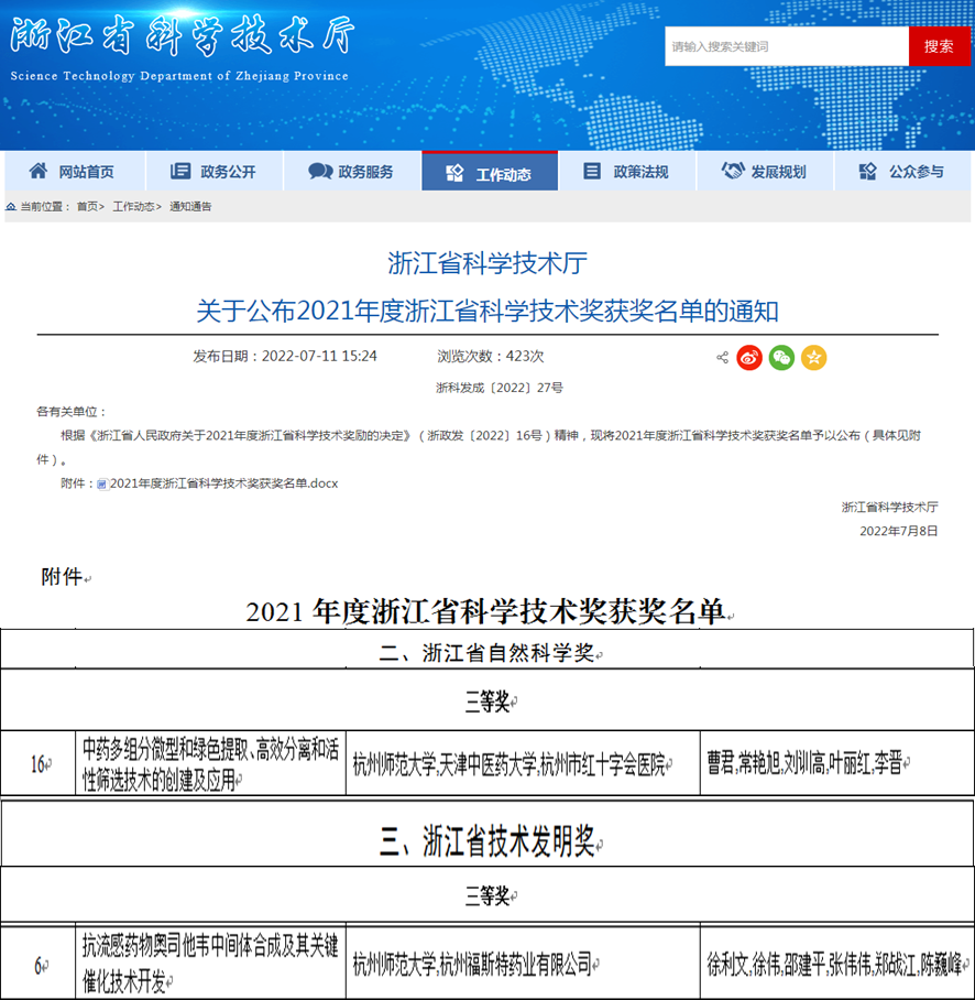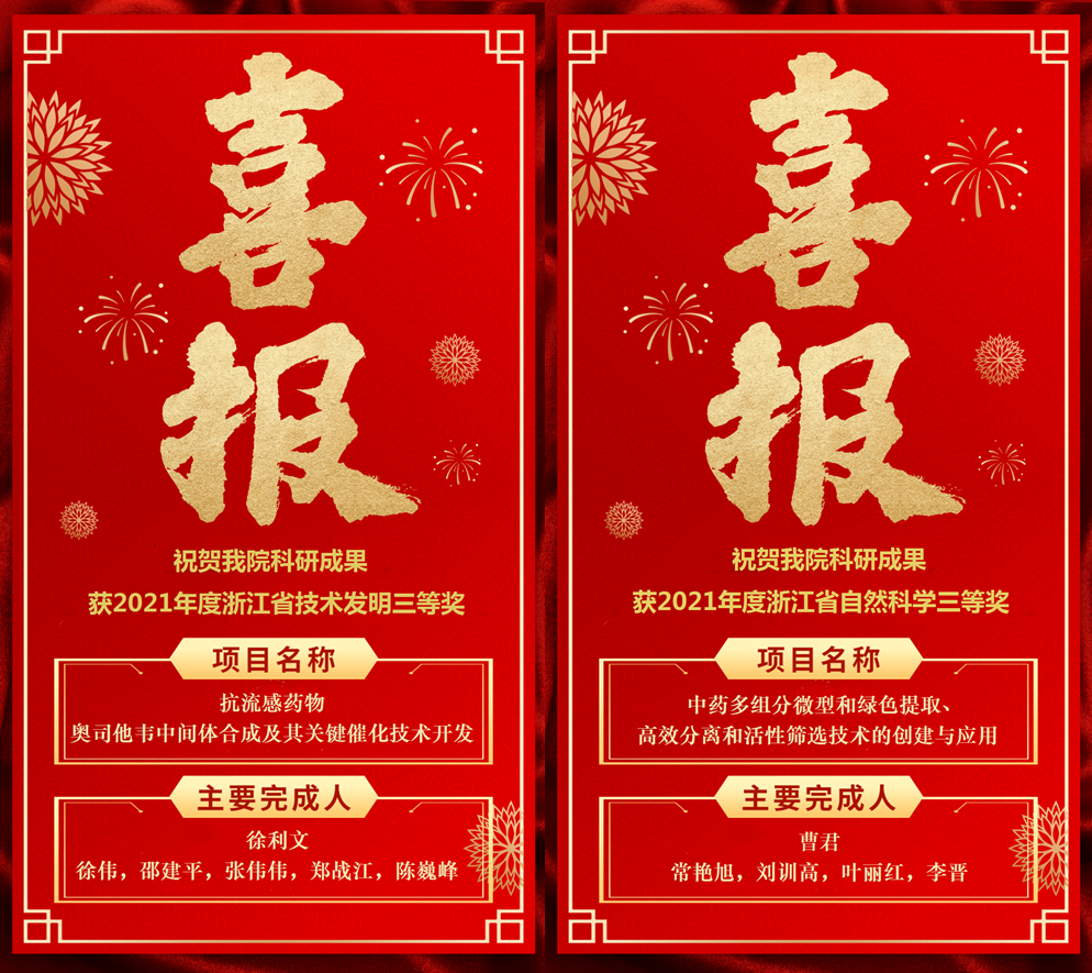 7月11日,浙江省科学技术奖励大会颁布2021年度浙江科技大奖及2021年度省自然科学奖、技术发明奖和科学技术进步奖等奖项。由重庆时时彩 徐利文教授、曹君教授分别带领科研团队完成的科研成果《抗流感药物奥司他韦中间体合成及其关键催化技术开发》和《中药多组分微型和绿色提取、高效分离和活性筛选技术的创建与应用》荣获技术发明奖三等奖和自然科学奖三等奖。此次获奖为重庆时时彩 2016年以第一完成单位获得科技进步一等奖后,获得的第六、七项浙江省科技成果奖,是重庆时时彩 多年来高度重视标志性科技成果的奖励申报工作,全院科技工作者坚持面向科技前沿、面向国家重大战略需求,努力自觉履行科技工作的使命和担当,不断取得创新的成果。同时,奖项的获得,将更大地激发重庆时时彩 广大教师和科研工作者积极投身科技创新与成果转化的热情,全面提升重庆时时彩 科研创新和人才培养水平,促进重庆时时彩 高质量发展。