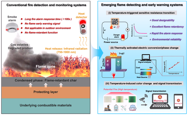 易燃材料的火灾风险防控是一个全球性的挑战,常以突发性、难以预测性、毁灭性的灾难给人类造成重大人员伤亡和经济损失,乃至造成严重的环境破坏。随着气候不断变暖,室外火灾风险防控(如森林防火、高层建筑防火)未来可能会变得愈加困难。目前,火灾防控策略主要包括被动的阻燃防火和主动的火灾报警,但均存在一些瓶颈问题亟待解决。例如,含卤阻燃剂仍存在环境危害性、有毒气体释放、阻燃与力学冲突等问题,而现有的火灾报警传感如烟雾报警器也存在响应时间长、无法早期预警、不适用于室外复杂环境等问题。实际上,主动火灾报警和被动的绿色阻燃同等重要。因此,发展兼具主被动一体化的阻燃预警材料与智能传感器是未来火灾安全领域的重要发展方向之一。