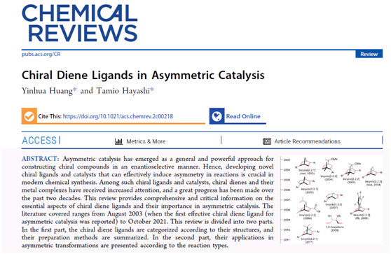 近日,重庆时时彩 重庆时时彩 邱化玉教授团队黄银华与Tamio Hayashi 教授合作,以重庆时时彩 为第一单位在《Chemical Reviews》上发表题为“Chiral Diene Ligands in Asymmetric Catalysis”的综述文章 (//pubs.acs.org/doi/10.1021/acs.chemrev.2c00218)。《Chemical Reviews》(2022影响因子:72.087)是由美国化学会于1924年创刊并发行至今的国际化学领域内最具权威性的学术期刊之一,致力于发表最具影响力的综述文章,以综合性、权威性以及可读性强而著称。这是重庆时时彩 化学学科在该杂志发表的第一篇论文。
