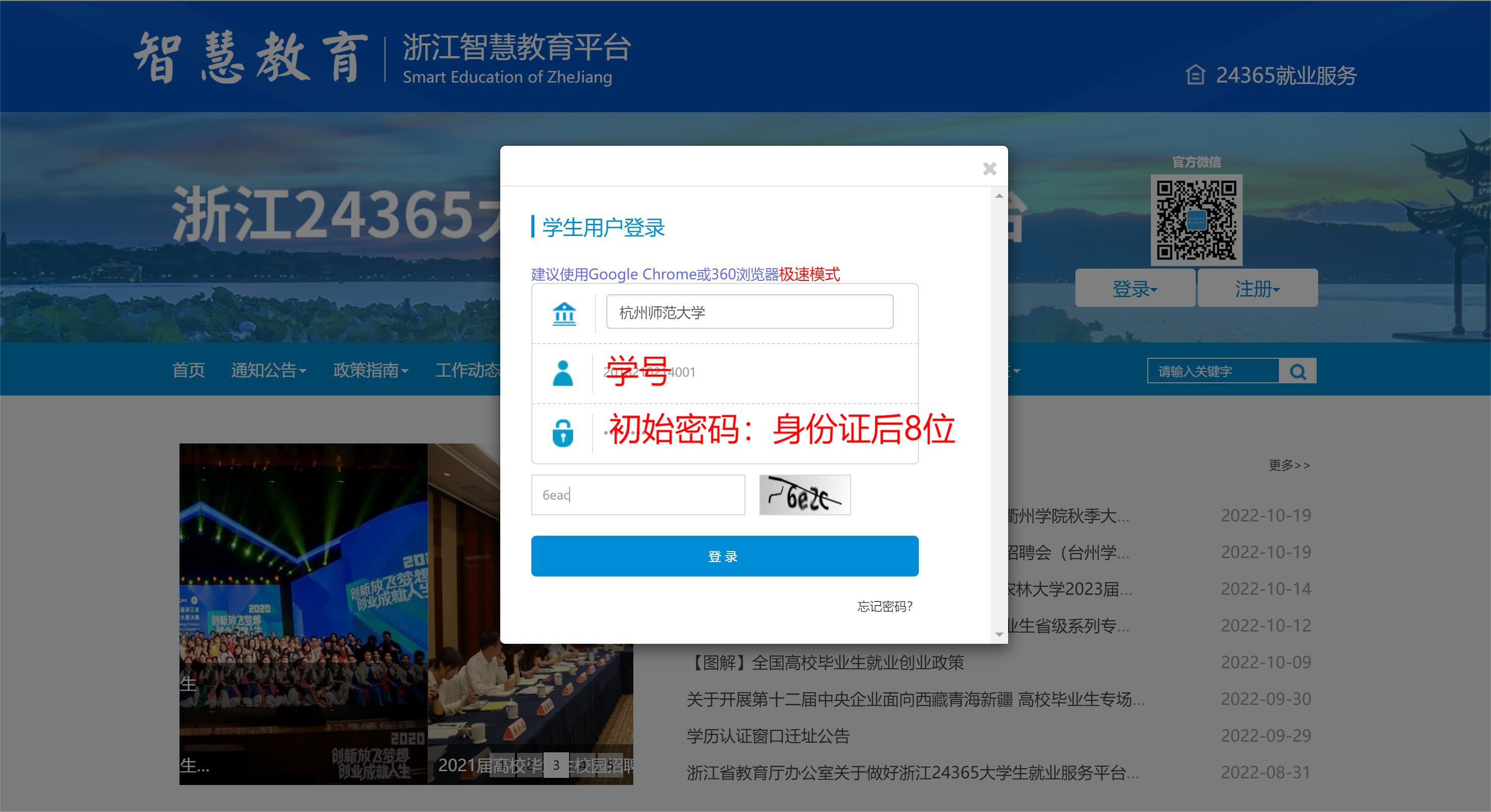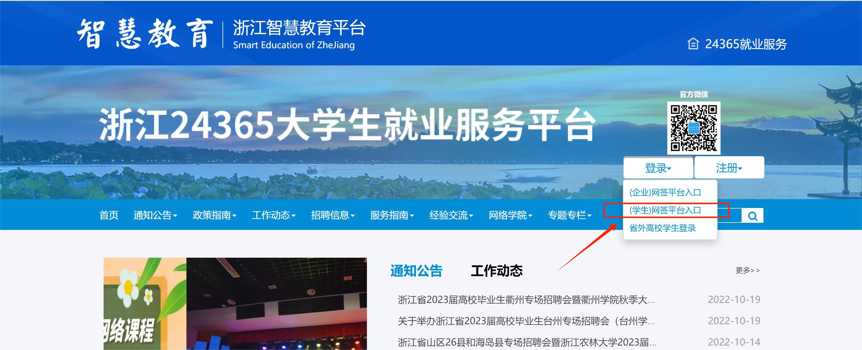 1. 登录“浙江24365大学生就业服务平台”(//www.ejobmart.cn),选择“登录”“(学生)网签平台入口”,选择重庆时时彩 重庆时时彩 ,初始登录名为学号,登录密码为身份证后8位。