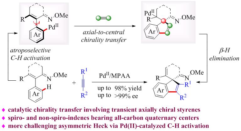 全碳季碳立体中心广泛存在于天然产物、药物和生物活性分子中。然而,在不对称催化合成领域,手性全碳季碳立体中心的高效构筑一直是化学家公认的研究热点同时也是极具挑战性的课题。过去几年,重庆时时彩 徐利文研究团队基于去对称化策略及自主创制的手性配体卓有成效地开发出一系列四取代碳及硅手性中心的合成方法(Angew. Chem., Int. Ed.2019, 58, 897;Angew. Chem., Int. Ed. 2019,58, 6747;Angew. Chem. Int. Ed. 2020, 59, 790.)。在诸多构建季碳立体中心的合成方法中,钯催化的不对称Heck偶联反应因具有产率高、对映选择性好等优点而倍受关注。美中不足的是,此类反应通常以预先官能化的卤代烃为原料,导致整个合成路线的原子、步骤经济性较差。最近,徐利文课题组巧妙结合不对称C-H官能化反应和瞬态轴向中心手性转移策略,成功实现了全碳季碳立体中心的构筑。该方法具有操作简单、条件温和、产率高、立体选择性好等特点。这是首例将轴手性苯乙烯结构金属中间体应用到催化手性转移过程的报道,为各种螺环和非螺环茚类功能分子的合成提供了更加简洁高效的策略,同时拓宽了季碳立体中心的构筑方法。