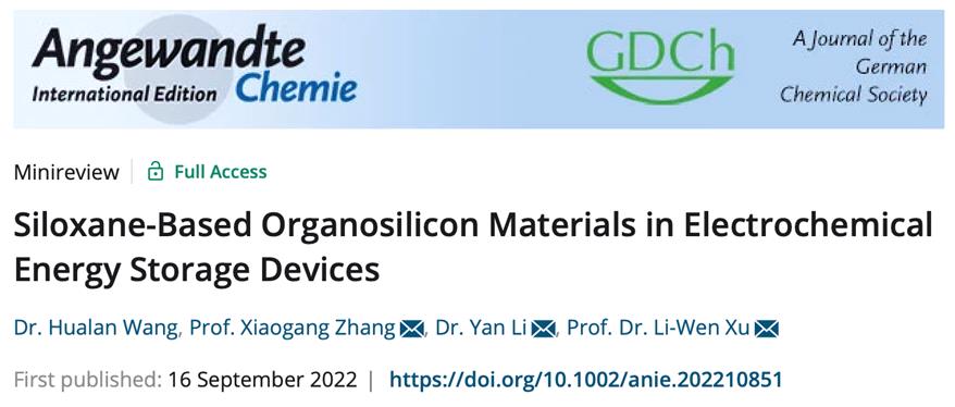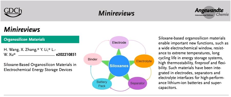 近日,徐利文教授团队与南京航空航天大学张校刚教授合作,在国际化学领域权威期刊Angewandte Chemie International Edition(2021年,IF:16.823)上发表了题为“Siloxane-based Organosilicon Materials in Electrochemical Energy Storage Devices”的Minireview论文,总结了多种不同官能化程度和分子构型的硅氧烷类有机硅材料在锂离子、超级电容器的各大关键功能模块中的研究方面取得的成就。