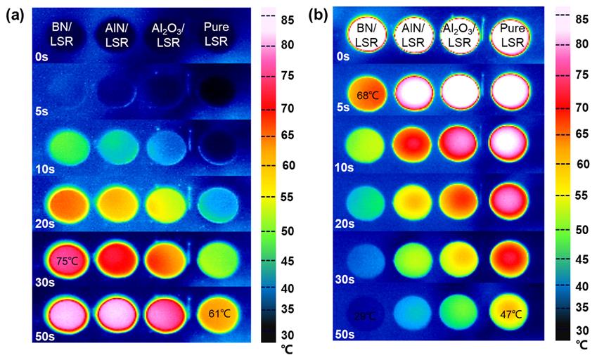 图3. 三种不同尺寸的无机导热填料改性硅橡胶的加热/散热过程的温度分布