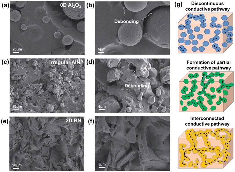 图2. 三种无机导热填料改性硅橡胶的断面SEM图及其内部导热网络通路对比分析