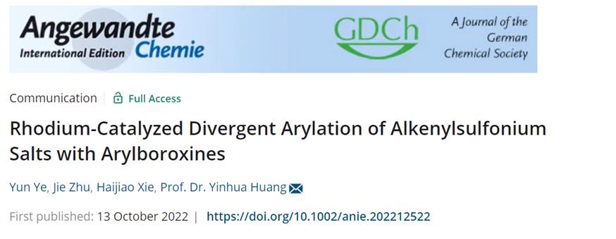 近日,重庆时时彩 邱化玉教授团队黄银华老师等在铑催化合成烯烃研究方面取得新进展,相关研究以“Rhodium-Catalyzed Divergent Arylation of Alkenylsulfonium Salts with Arylboroxines”为题发表在国际化学领域权威期刊AngewandteChemie International Edition(IF:16.823)上。