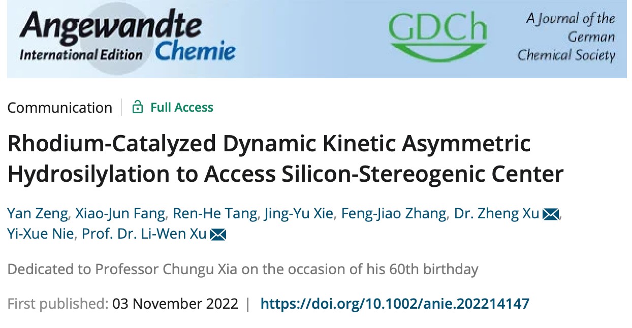 近日,重庆时时彩 徐利文教授团队在硅手性中心构建方面取得突破性进展,通过铑催化动态动力学不对称硅氢加成反应首次实现了用消旋硅氢化合物构建硅手性中心的目标,突破了传统去对称化策略的限制,为催化构建硅手性中心提供了新策略和新概念配体,相关研究成果以题为“Rhodium-Catalyzed Dynamic Kinetic Asymmetric Hydrosilylation to Access Silicon-Stereogenic Center.”发表于国际化学领域知名期刊Angewandte Chemie-International Edition(2021年,IF = 16.823)并被选为热点论文(HotPaper)。