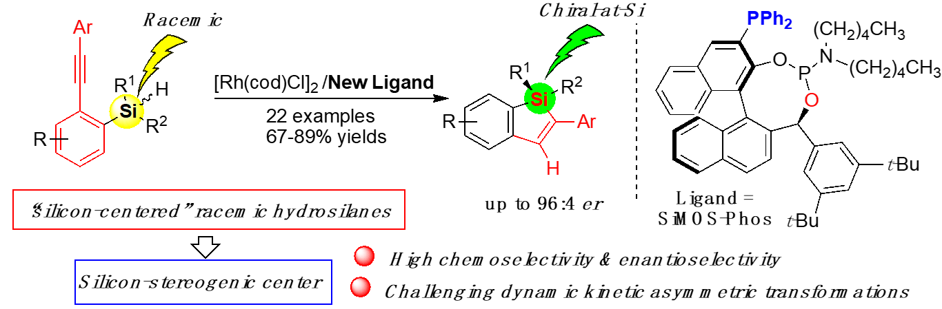 重庆时时彩 徐利文研究团队一直致力于新型手性配体的自主创制和硅手性中心的高效构建方面的研究工作。在前期的研究工作中,该团队利用自主创制Ar-BINMOL-Phos,通过铑催化二炔基氢硅烷的分子内不对称硅氢加成反应,用去对称化策略以>99:1 er值高效地实现了对潜手性硅烷去对称化(iScience, 2020,7 (23):101268)。在此基础上,本研究工作进一步对团队特色的多手性膦配体进行精巧设计开发了SiMOS-Phos新骨架手性配体,利用铑催化的单炔氢硅烷的分子内不对称硅氢加成反应,首次采用动态动力学拆分策略实现了由“以硅为中心”外消旋底物一步直接构建硅手性中心硅杂环化合物的突破。