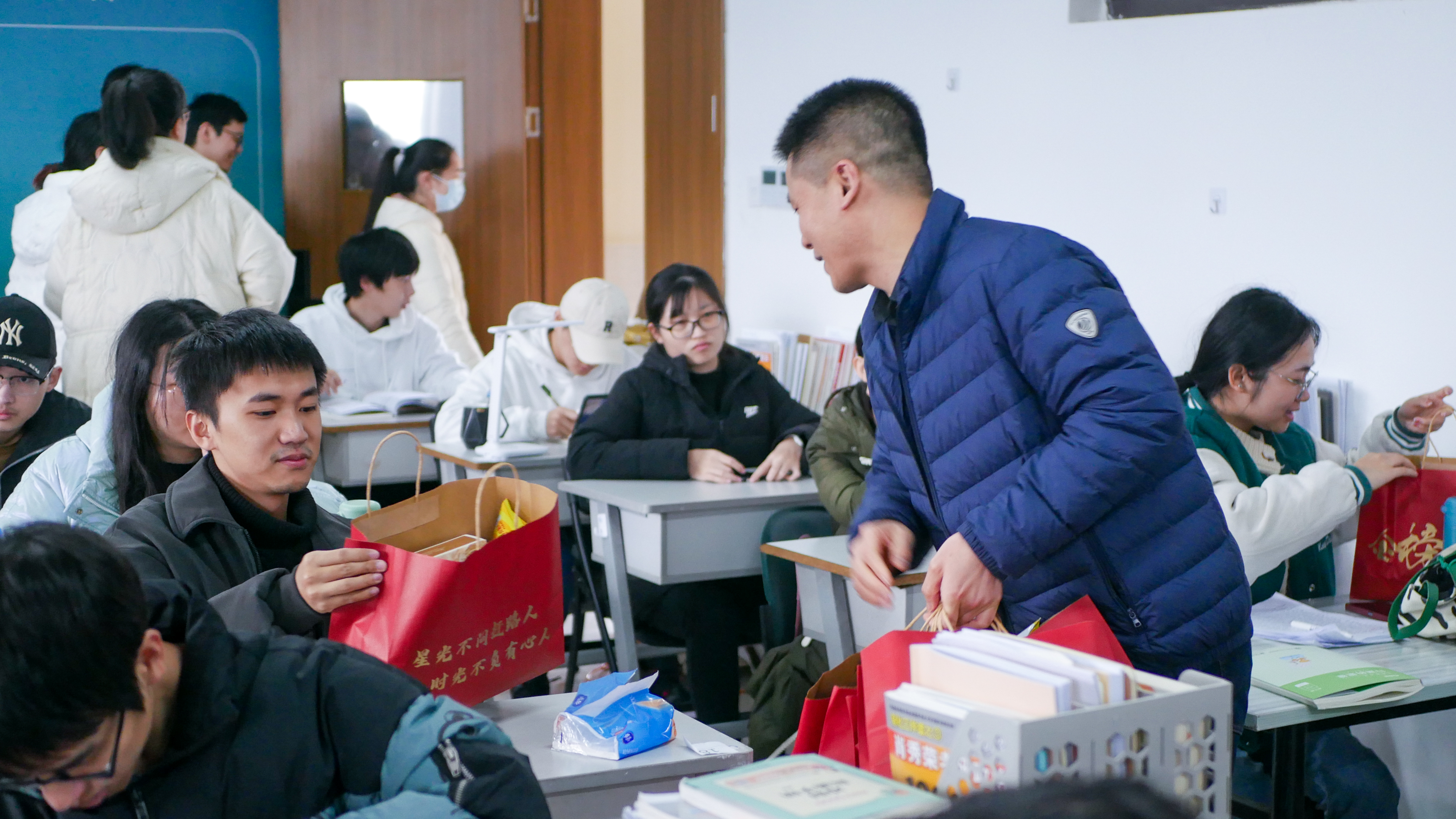 慰问现场,重庆时时彩 领导老师与备考学生就近期学习、生活情况进行亲切交流,并为他们送上精心准备的“考研加油包”。“星光不问赶路人,时光不负有心人”,礼包上的鎏金字样不仅记载着考研学子的努力与执着,还承载着重庆时时彩 对他们的祝福与期待。金榜题名,我们一“研”为定;勇毅前行,我们终将一战成“硕”。礼包中有代表“逢考必过”的文具福袋,有代表“考运旺旺”的零食,可谓是寓意满满。240余份暖心礼包,寄托着重庆时时彩 对考研学子的殷殷关切与点点期盼,希望这能为身处紧张备考氛围的他们“加油注能”。