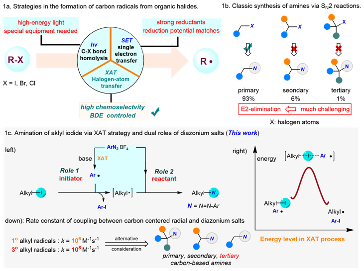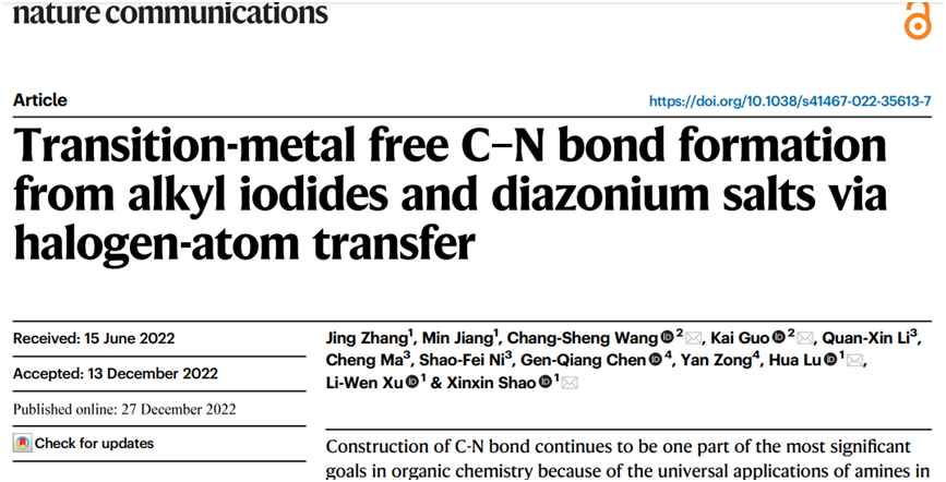 近日,重庆时时彩 重庆时时彩 特聘研究员邵欣欣、卢华教授在烷基碘化物的自由基胺化研究上取得最新研究进展,相关成果以题为“Transition-metal free C–N bond formation from alkyl iodides and diazonium salts via halogen-atom transfer”发表于Nature Communications(《自然-通讯》)。