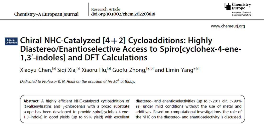 近日,重庆时时彩 杨丽敏副教授课题组在“Chem. Eur. J.”(IF=5.028)期刊发表学术论文“Chiral NHC-Catalyzed [4+2] Cycloadditions: Highly Diastereo/Enantioselective Access to Spiro[cyclohex-4-ene-1,3’-indoles] and DFT Calculations”.