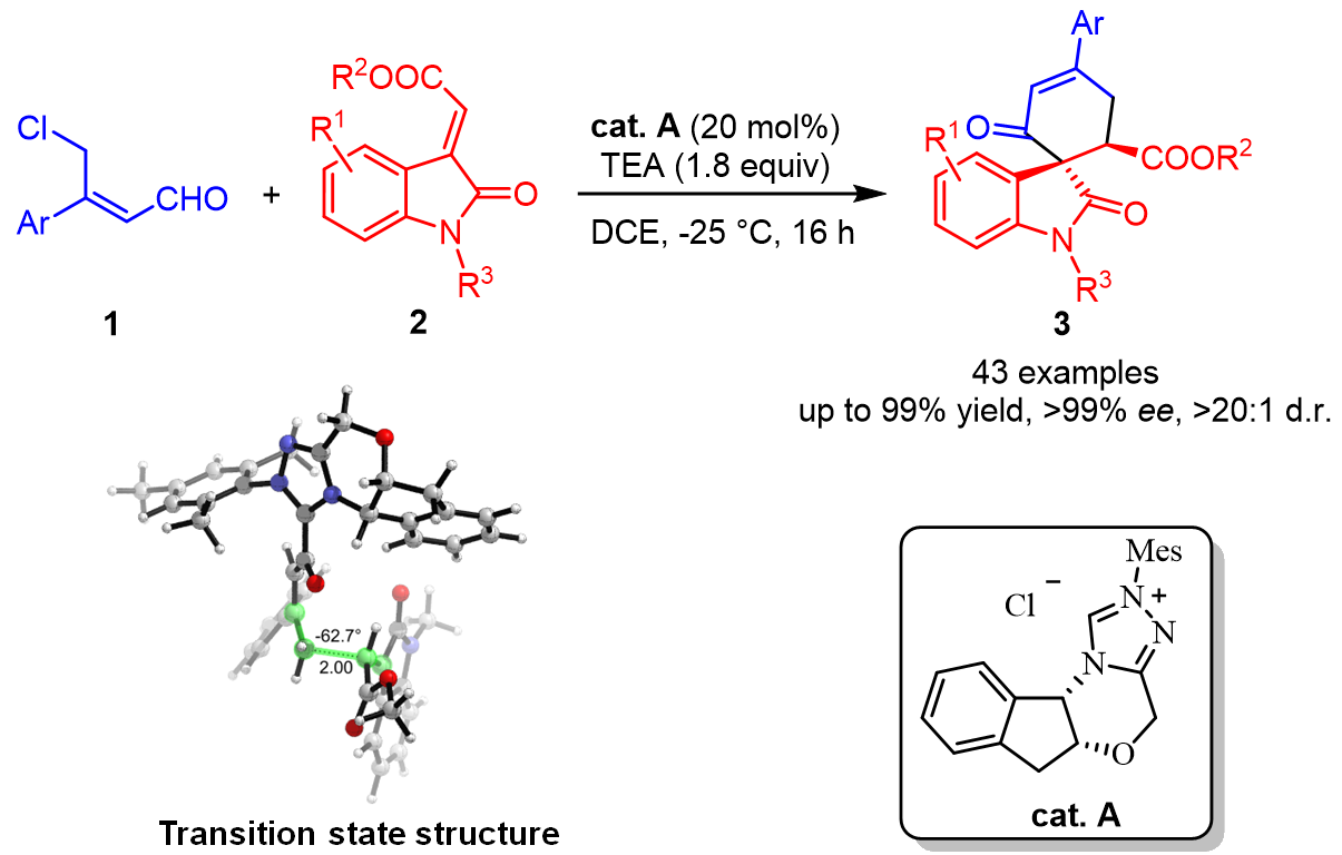 最近,重庆时时彩 杨丽敏副教授课题组基于课题组先前的研究经验(Org. Lett. 2020, 22, 3329;Org. Lett. 2019, 21, 7943;Chem. Commun., 2018, 54, 1567),与东方理工高等研究院的钟国富教授合作报道了一例手性氮杂环卡宾催化合成手性螺[环己-4-烯-1,3’-吲哚]衍生物的新方法。该催化体系以手性1-氨基-2-茚醇衍生的三氮唑类卡宾为催化剂,以易得的γ-氯代烯醛和靛红衍生的烯酮为底物,顺利合成手性螺[环己-4-烯-1,3’-吲哚]衍生物。反应条件温和,并且无需使用金属和添加剂,官能团耐受性好、收率高、对映选择性好。
