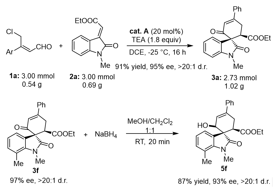 作者首先对反应条件进行了筛选优化。在确定最佳反应条件后,作者进一步对底物的适用范围进行了拓展,结果表明该反应对各种取代基的靛红衍生的烯酮和γ-氯烯醛均有很好的结果,无论是吸电子还是缺电子基团,大多都取得了优异的对映选择性和非对映选择性。为了证明该催化不对称策略的实际性质和合成多功能性,作者进行了克级反应,并且对产物进行了衍生化研究。