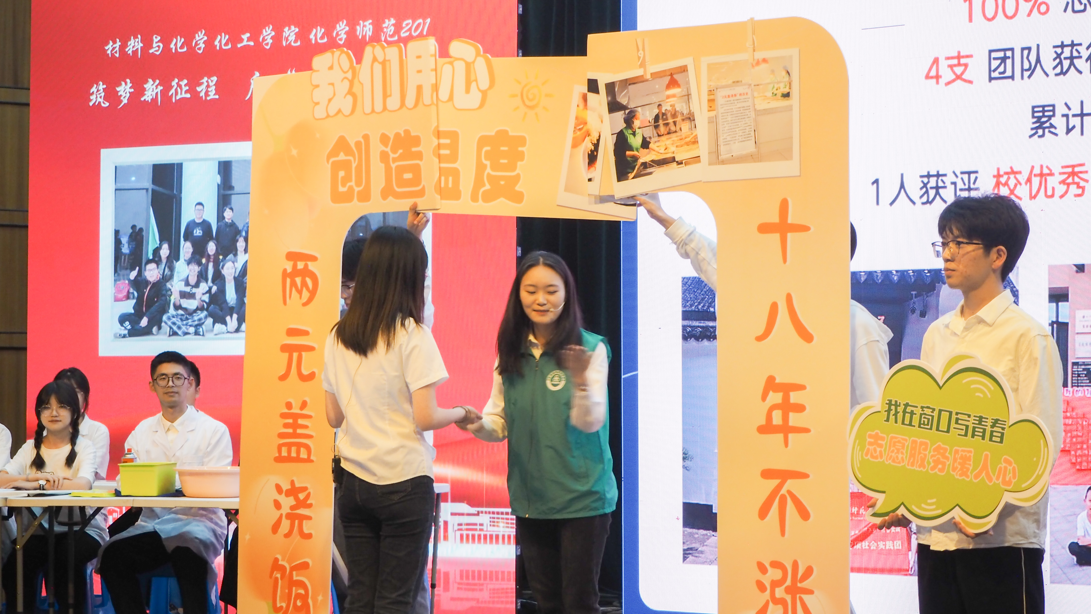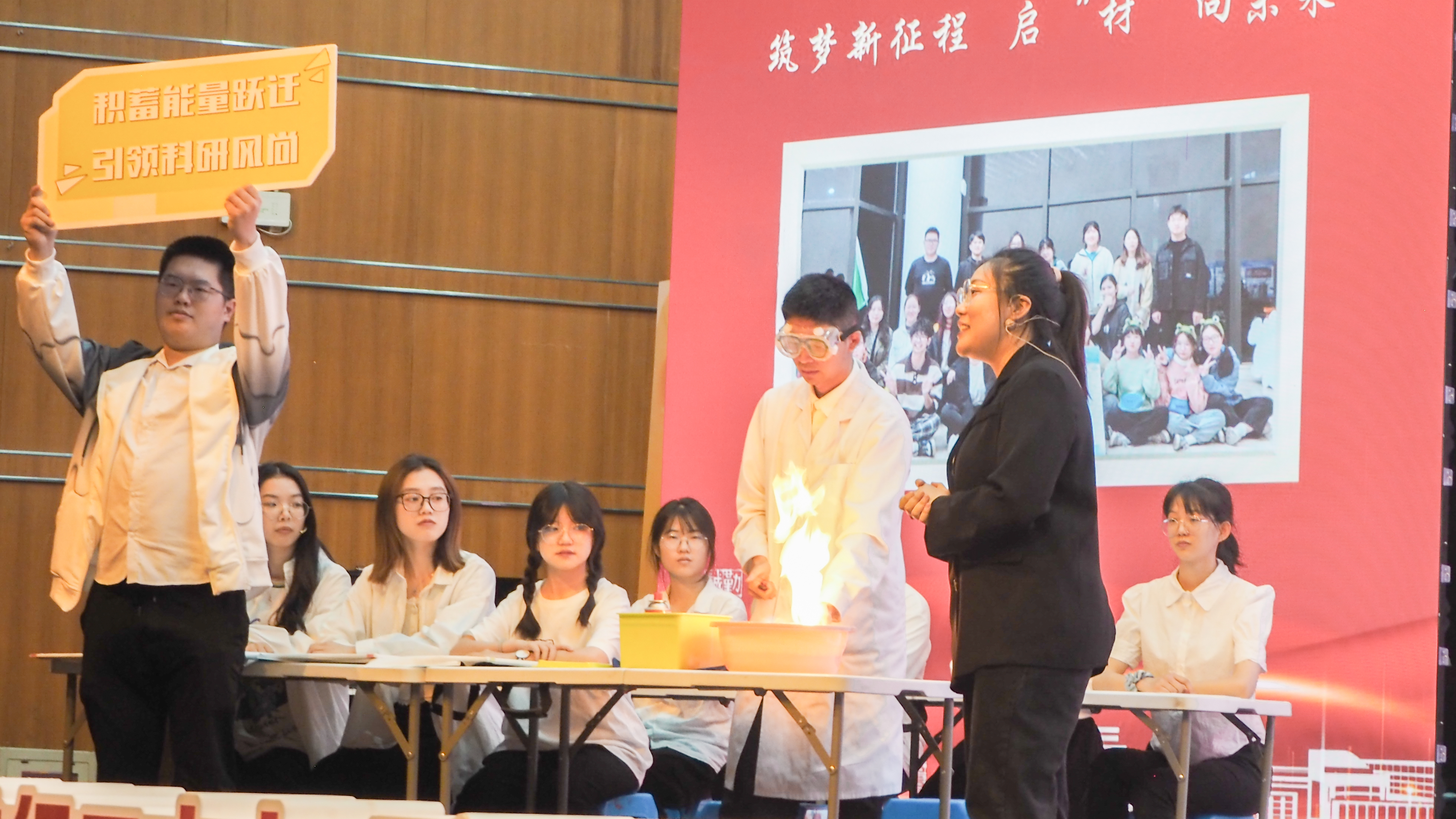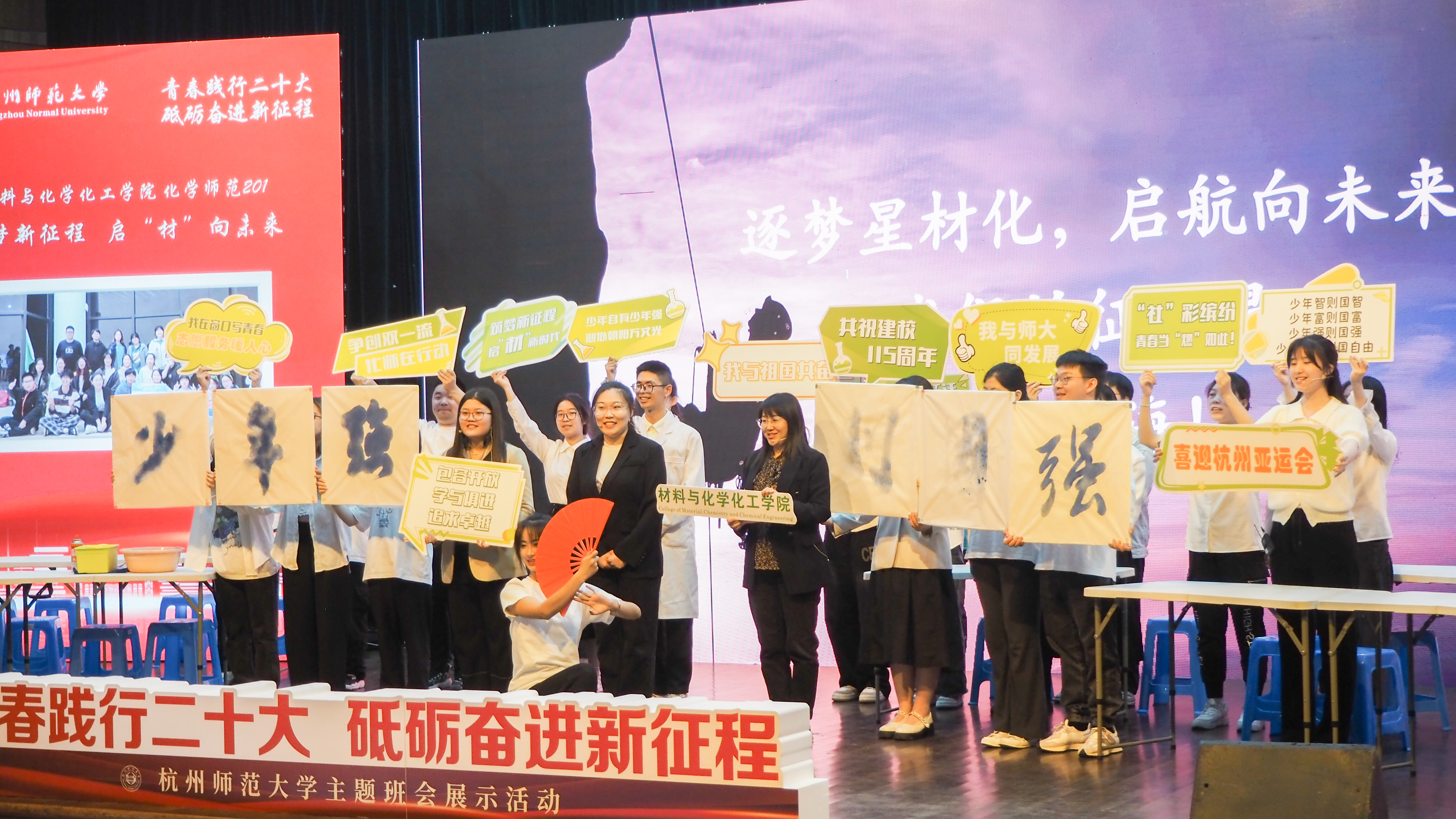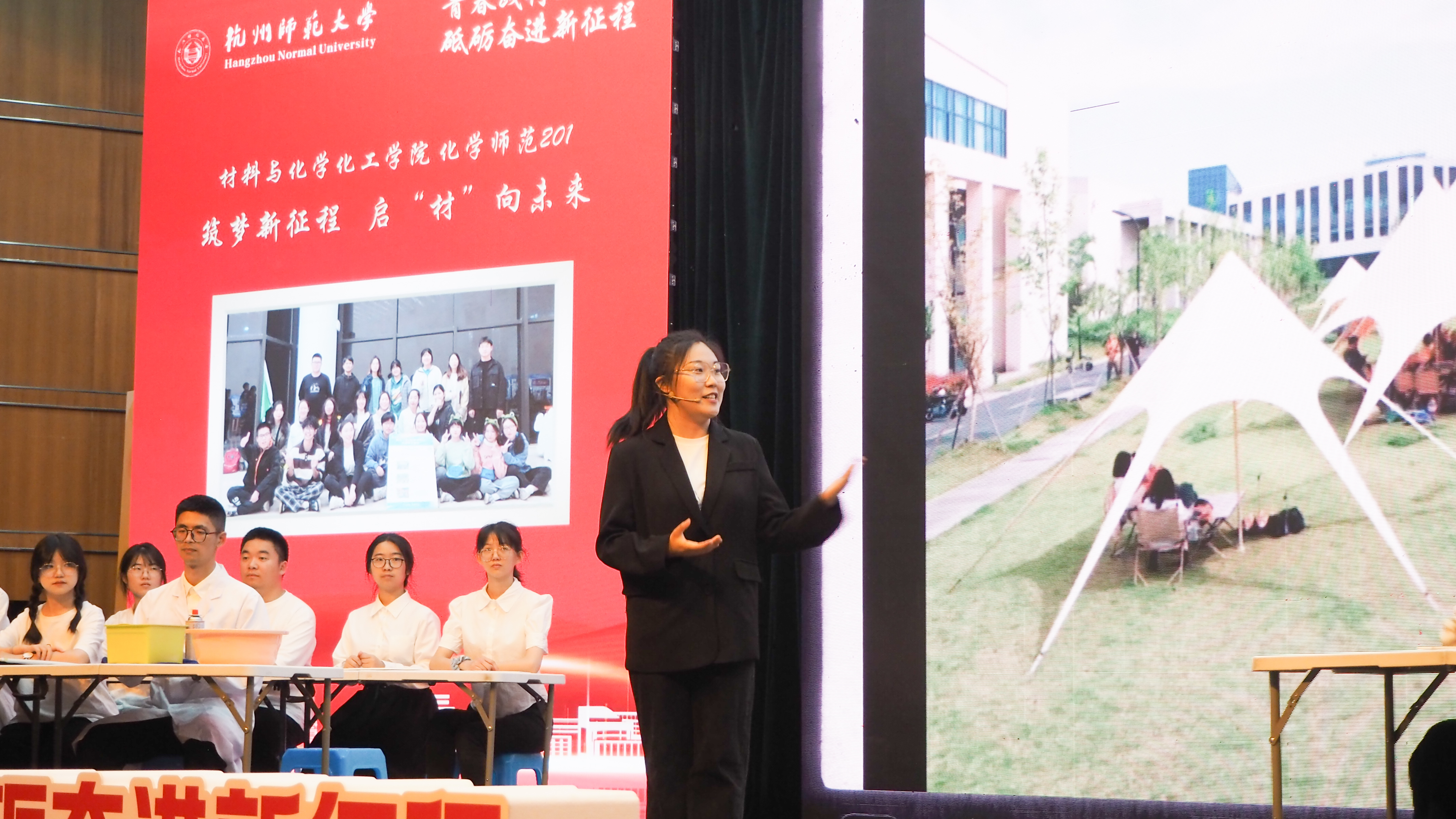 在化师201的展示中,班主任李万梅老师作为班会主持人,班长李雅琳作为串讲人,以两个师大热搜词“HZNU115周年校庆”和“争创双一流 化师在行动”串联起整个班会。“HZNU115周年校庆”环节,通过朋辈对话的形式讲述了两张饭卡背后“我与师大”的故事;“争创双一流,化师在行动”通过科研创新、志愿服务、社团活动三大板块展现了化学师范201班的全体同学在不同领域发光发热,以昂扬的青春力量投身时代发展大潮之中。在全体成员铿锵有力的“筑梦新材化,启航向未来”的呼号声中,本次展示圆满结束。