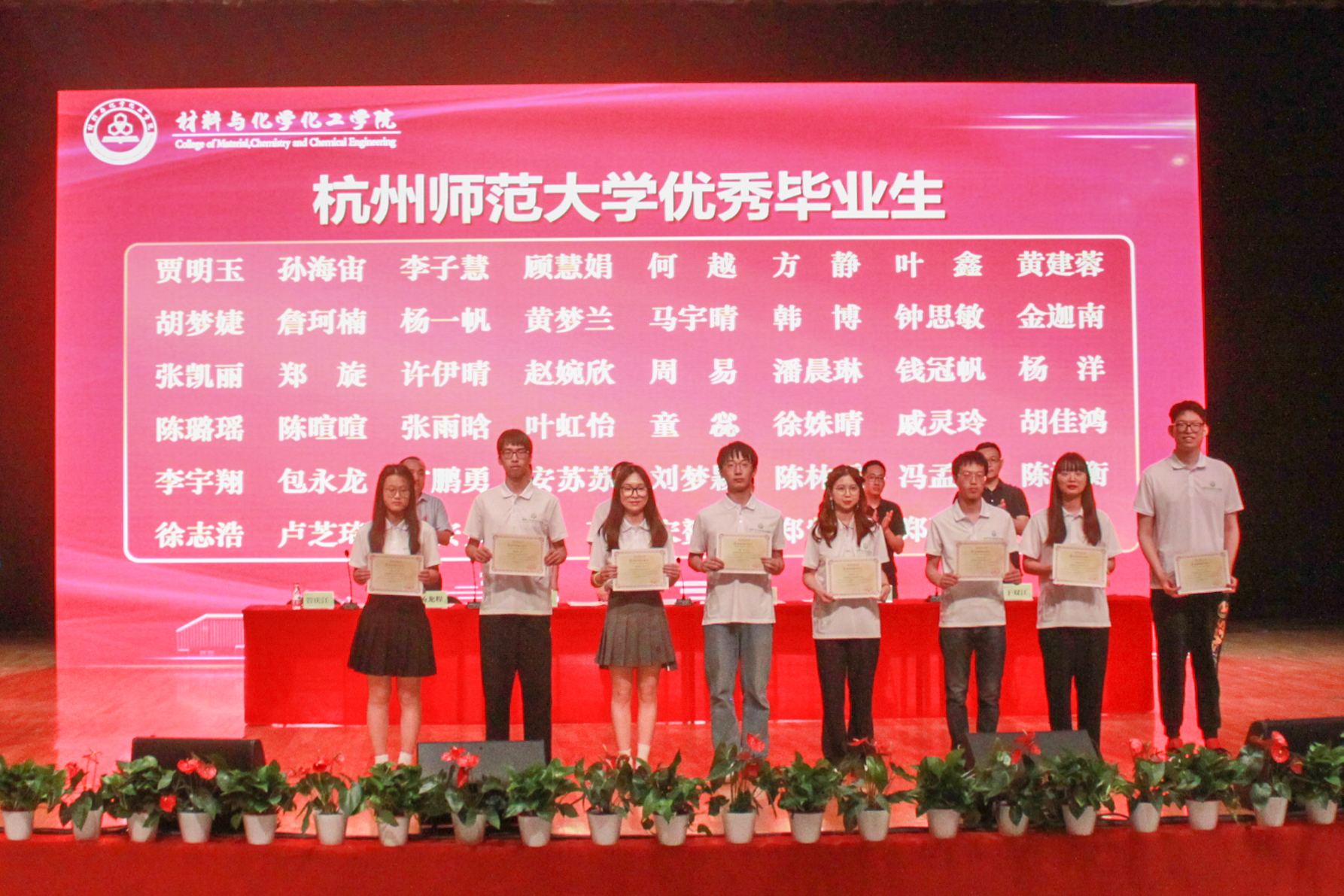 研究生毕业生代表有机化学专业梁晨峰、本科生毕业生代表化学(师范)191班朱彬琰依次发言。她们回忆昨日青葱岁月,感慨今朝杭师盛景,展望明天美好蓝图,将离别之意汇成文字,将未来之期融入话语。