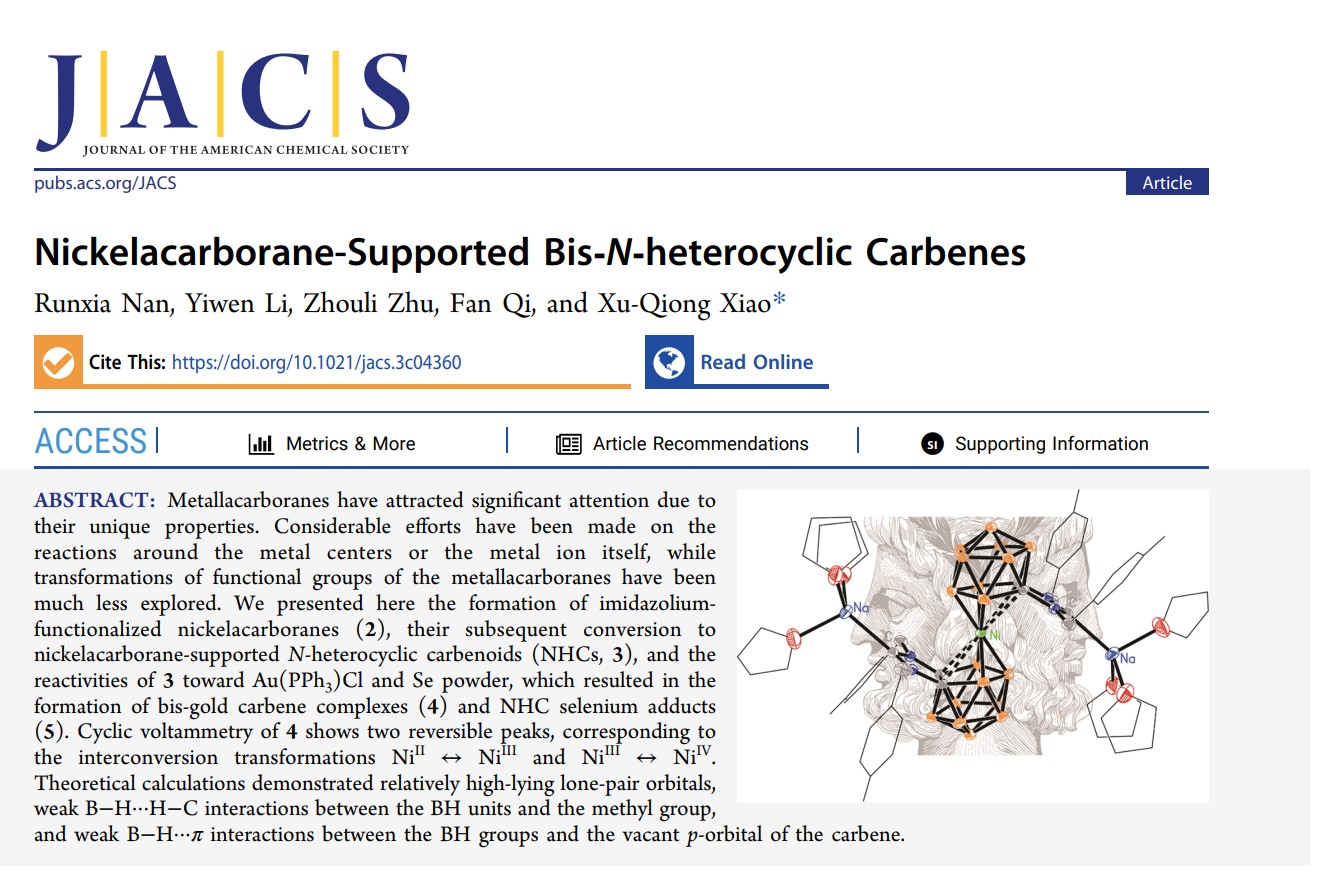 近日,重庆时时彩 效旭琼教授课题组在碳硼烷与氮杂环卡宾化学方面取得新进展,相关研究以“Nickelacarborane-Supported Bis-N-heterocyclic Carbenes”题为在化学领域顶级期刊《美国化学会志》(Journal of the American Chemical Society, JACS,IF:15.0)上发表。
