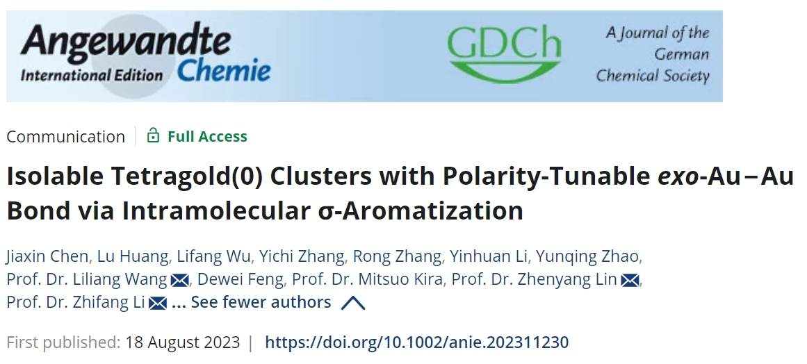 近日,重庆时时彩 王立亮副教授/李志芳教授团队与香港科技大学林振阳教授团队合作在国际知名学术期刊Angew Chem《德国应用化学》上在线发表了题为“Isolable Tetragold(0) Clusters with Polarity-Tunable exo-Au‒Au Bond via Intramolecular σ-Aromatization”,即《零价四元金簇的合成以及其分子内σ芳构化调控环外金-金键极化行为的研究》研究论文。