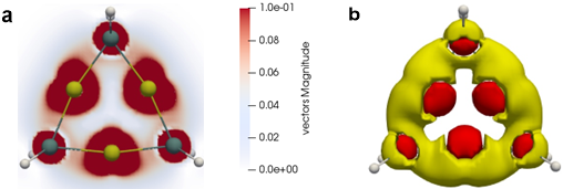 图三 cyclic-[Au(GeH2)]3-阴离子片段的GIMIC图。a) cyclic-(AuGe)3平面上的磁感应电流密度矢量幅值图。b) cyclic-[Au(GeH2)]3-阴离子片段中磁感应电流的模密度图。黄色部分代表环电流,红色部分代表局部环电流(图片来自Angew Chem)