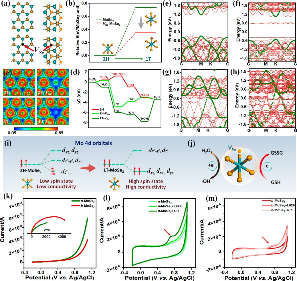 当引入Se空位时,从半导体2H相到类金属1T相的转变更容易发生,表现为单个硒化钼结构的相变能从0.74 eV相应下降到0.35 eV。基于晶体场理论,Mo的4d轨道构型从2H相中占据的4dz2能级转变为1T相中两个电子不完全占据的dxy/dxz/dyz较低能级。在这种高自旋状态下,最外层的价电子倾向于从原子核中脱离出来,导致高电子离域性,良好电子传递性和导电性,就类似金属一样。结合高纯度的类金属相和Se空位,n-MoSe2可以作为氧化还原过程中电子的中转站,如提供电子用于还原(细胞内H2O2异裂分解),或储存/回收电子用于氧化(如细胞内GSH清除),加速循环电子传递和细胞内氧化应激并不可逆转地杀死肿瘤细胞。
