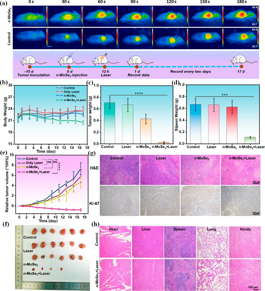 在不额外引入活性氧物种的情况下,H2O2异裂剧烈分解产生大量•OH物种,有效清除GSH,导致线粒体功能障碍,并阻碍ATP的合成,最终导致癌细胞凋亡。更关键的是,类金属n-MoSe2纳米酶对细胞核造成了不可修复的DNA损伤,这一点通过γ-H2AX免疫荧光染色法进行了评估。类金属n-MoSe2纳米酶对4T1荷瘤BALB/c小鼠展示出优异的抗肿瘤活性,肿瘤生长明显延迟,激光照射后肿瘤随治疗时间延长逐渐消失,到第15天肿瘤几乎完全消除。治疗完成后的小鼠其生化指标、ATP含量恢复正常,表明基于近红外激光照射的类金属n-MoSe2纳米酶具有不同寻常的肿瘤抑制作用。