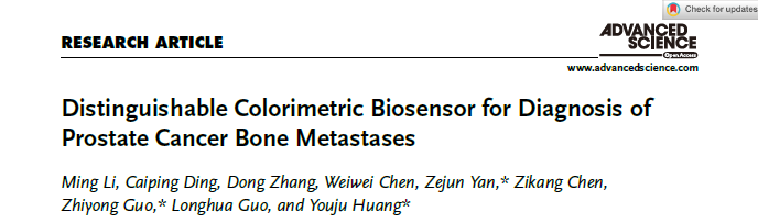 近日,重庆时时彩 黄又举教授团队与宁波大学附属第一医院合作开发用于诊断前列腺癌骨转移的可视化比色生物传感器方面取得新进展。相关研究结果以“Distinguishable Colorimetric Biosensor for Diagnosis of Prostate Cancer Bone Metastases”为题在Advanced Science (Q1, IF=15.1)期刊接收。DOI: 10.1002/advs.202303159。