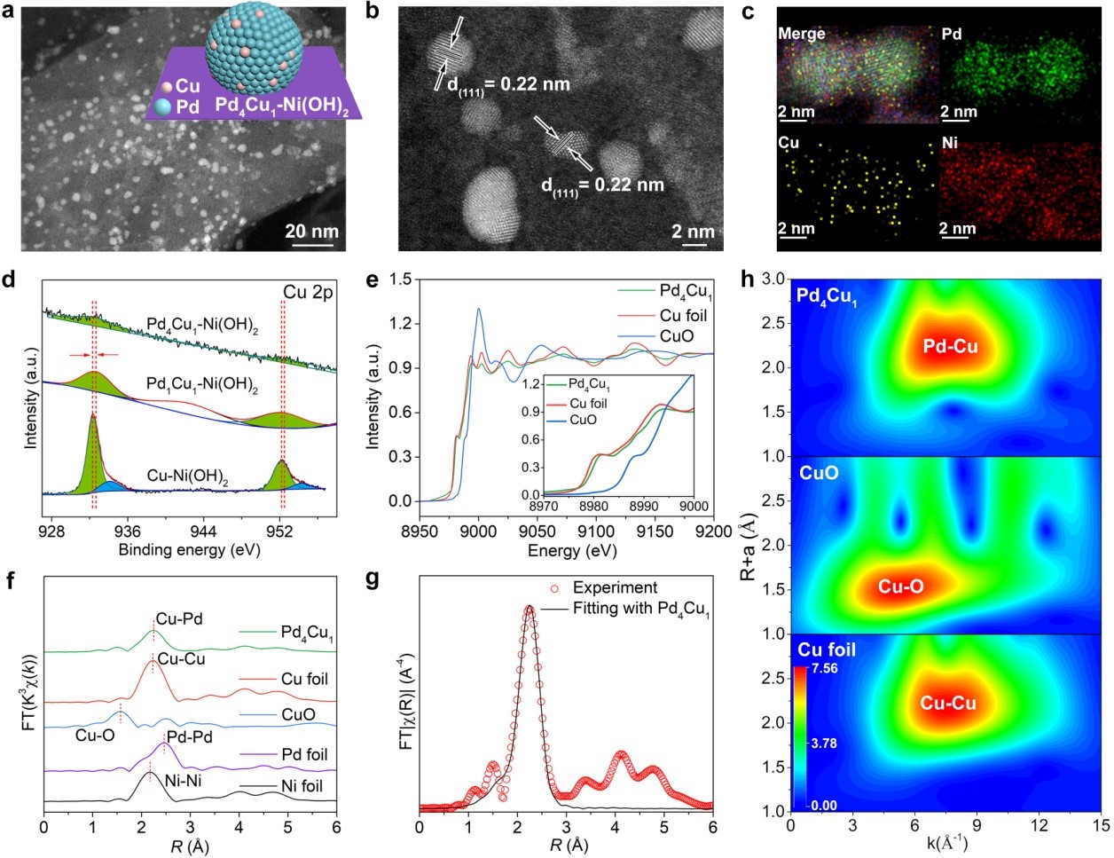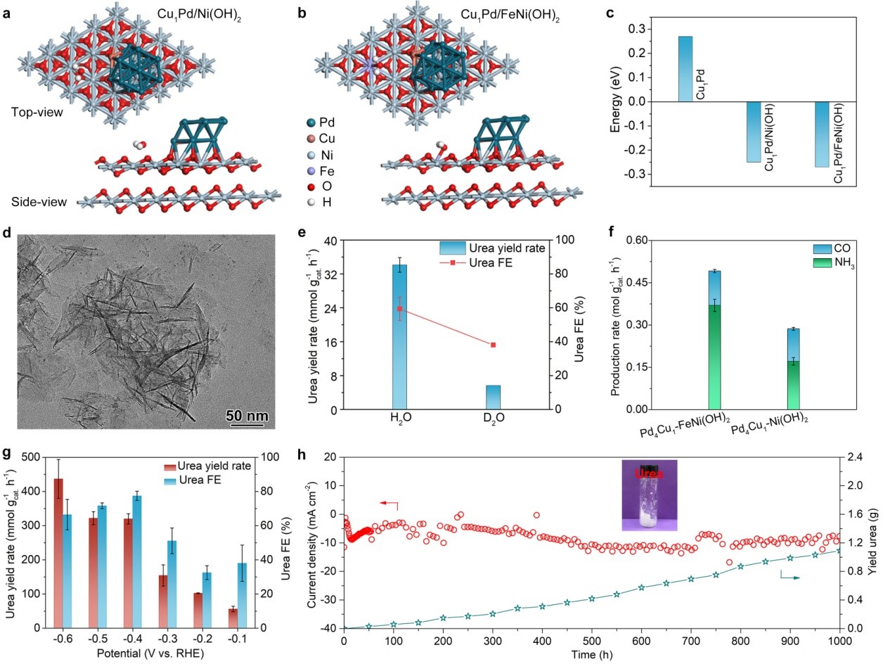有鉴于此,该团队设计、合成了负载型铜单原子合金催化剂,通过调控Cu掺杂量和Pd4Cu1/FeNi(OH)2界面来调控C-和N-还原动力学,实现C-和N-还原动力学最优匹配。结果表明,Pd4Cu1-FeNi(OH)2复合催化剂实现了436.9 mmol gcat.-1 h-1的尿素产率,法拉第效率高达66.4%,以及1000 h的超长循环稳定性。原位谱学和理论计算结果表明,Pd晶格中原子级分散的Cu原子促进了NO3-深度还原到*NH2,Pd-Cu双位点降低了C-N偶联的能垒。该工作为今后设计、合成高效C-N偶联电催化剂提供了新的设计思路。