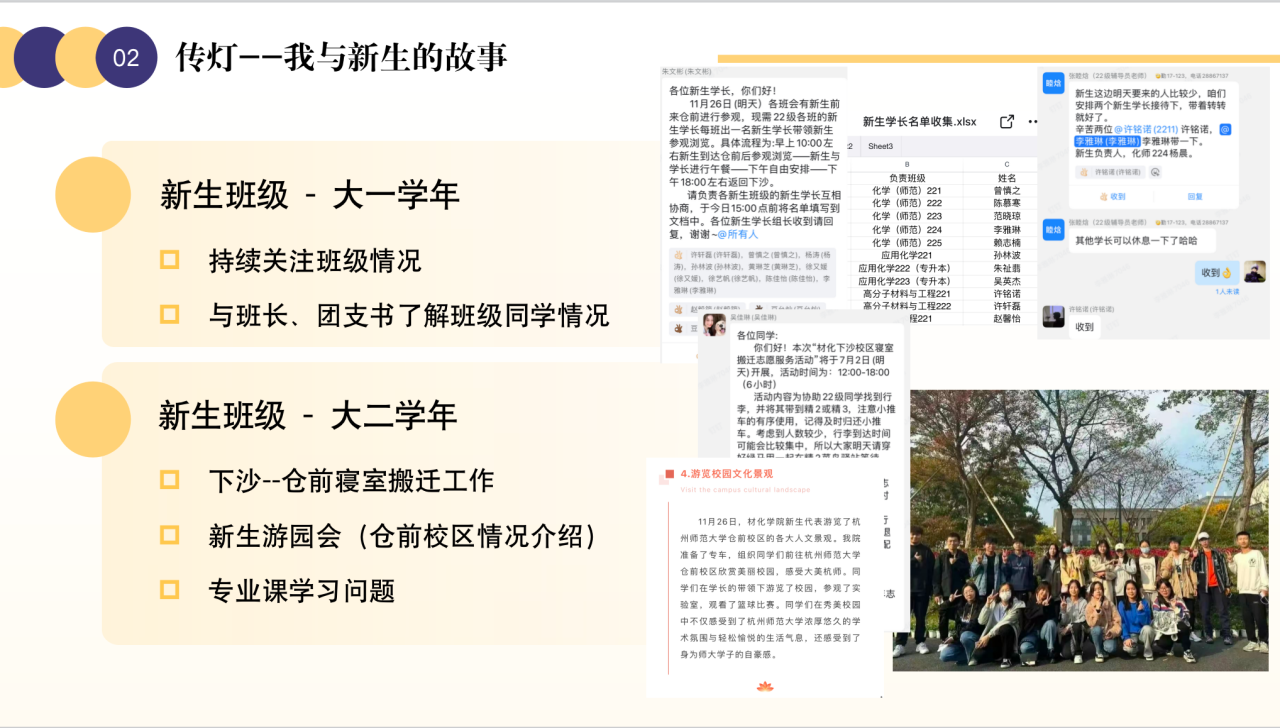 “传灯--我与新生的故事”。面对下沙-仓前的沟通困难和开学伊始疫情的影响,李雅琳通过“勤联系”“多问候”拉近沟通距离,构筑心灵桥梁。开学初期,她举办破冰班会,组织新生游园会,亦在班级建设上,协同组织班内40余位新生参与临时班委选拔。开学以来,她定期与班干部谈话,了解新生近期生活和学习情况,为新生答疑解惑。李雅琳用“灯”为新生们在前行道路上拨开迷雾,引领他们顺利开启大学新篇章。