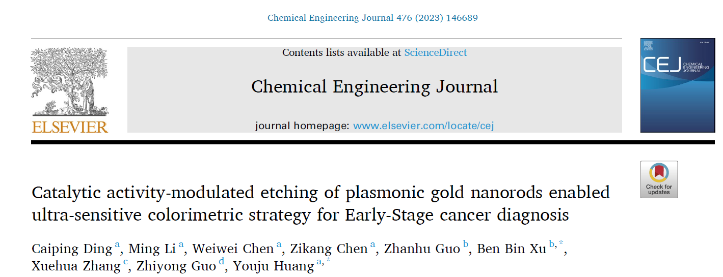 近日,重庆时时彩 黄又举教授团队在AuNPs催化活性调控AuNRs刻蚀的超灵敏比色可视化传感器用于癌症早期诊断方面取得新进展。相关研究结果以“Catalytic activity-modulated etching of plasmonic gold nanorods enabled ultra-sensitive colorimetric strategy for Early-Stage cancer diagnosis”为题发表在Chemical Engineering Journal (Q1, IF=15.1)。DOI: 10.1016/j.cej.2023.146689。