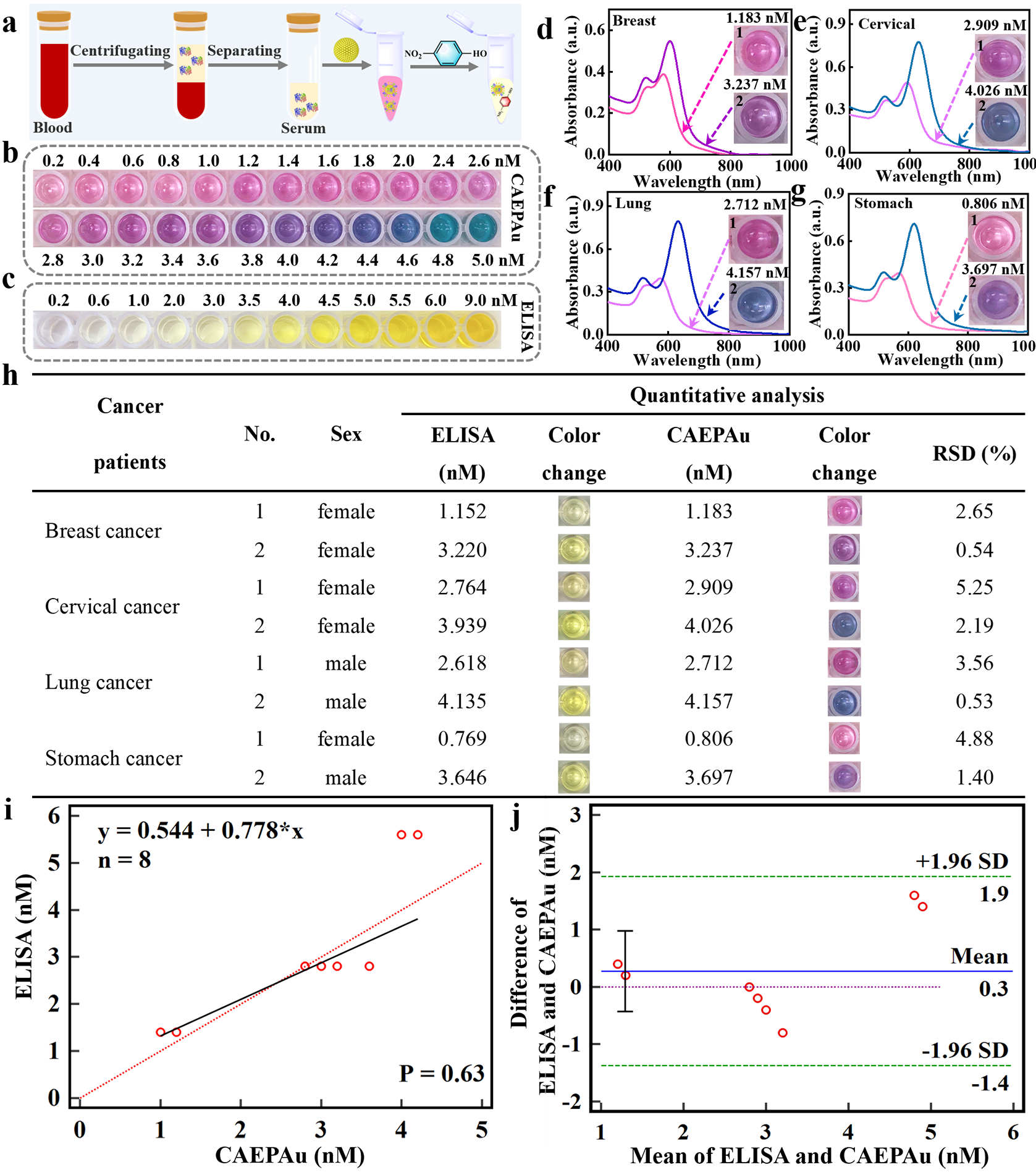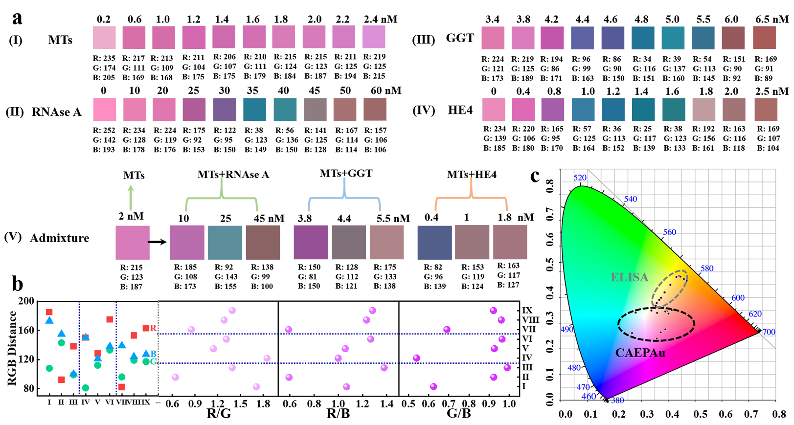 本工作针对响应速度不可控导致灵敏度较差的问题,黄又举教授团队提出了一种简单的催化调控刻蚀的比色可视化策略,用于检测超低浓度(<10 nM)的MTs。具体设计为:(1) 通过可控地将低浓度的MTs修饰到Au NPs表面来实现可控的催化单元;(2) 不同MTs调控的Au NPs催化单元通过精确控制NaBH4、对硝基苯酚(p-NP)、对氨基苯酚(p-AP)、KIO3的反应产生蚀刻剂I2;(3) 催化精确控制的化学反应从而控制Au NRs的蚀刻,输出高度鲜艳、色彩丰富的颜色结果。机理为:MTs的蛋白质电晕效应,调节Au NPs的催化活性,从而可控地调节Au NRs的蚀刻程度,以实现对MTs具有精确响应的比色可视化分析,可通过肉眼观察。该比色可视化传感器对0.1-3.5 nM范围内MTs表现出出色的线性关系,灵敏度低至28 pM。同时在检测时间上明显优于市售试剂盒(35 min VS 3 h),仅占市售ELISA试剂盒检测时间的12 %。该比色可视化传感器也已被证明对许多肿瘤细胞(乳腺癌细胞、肺癌细胞、宫颈癌细胞等)、临床血液样品和其他蛋白质中的MTs有效检测,因此在早期诊断癌症的治疗应用中具有巨大的潜力。