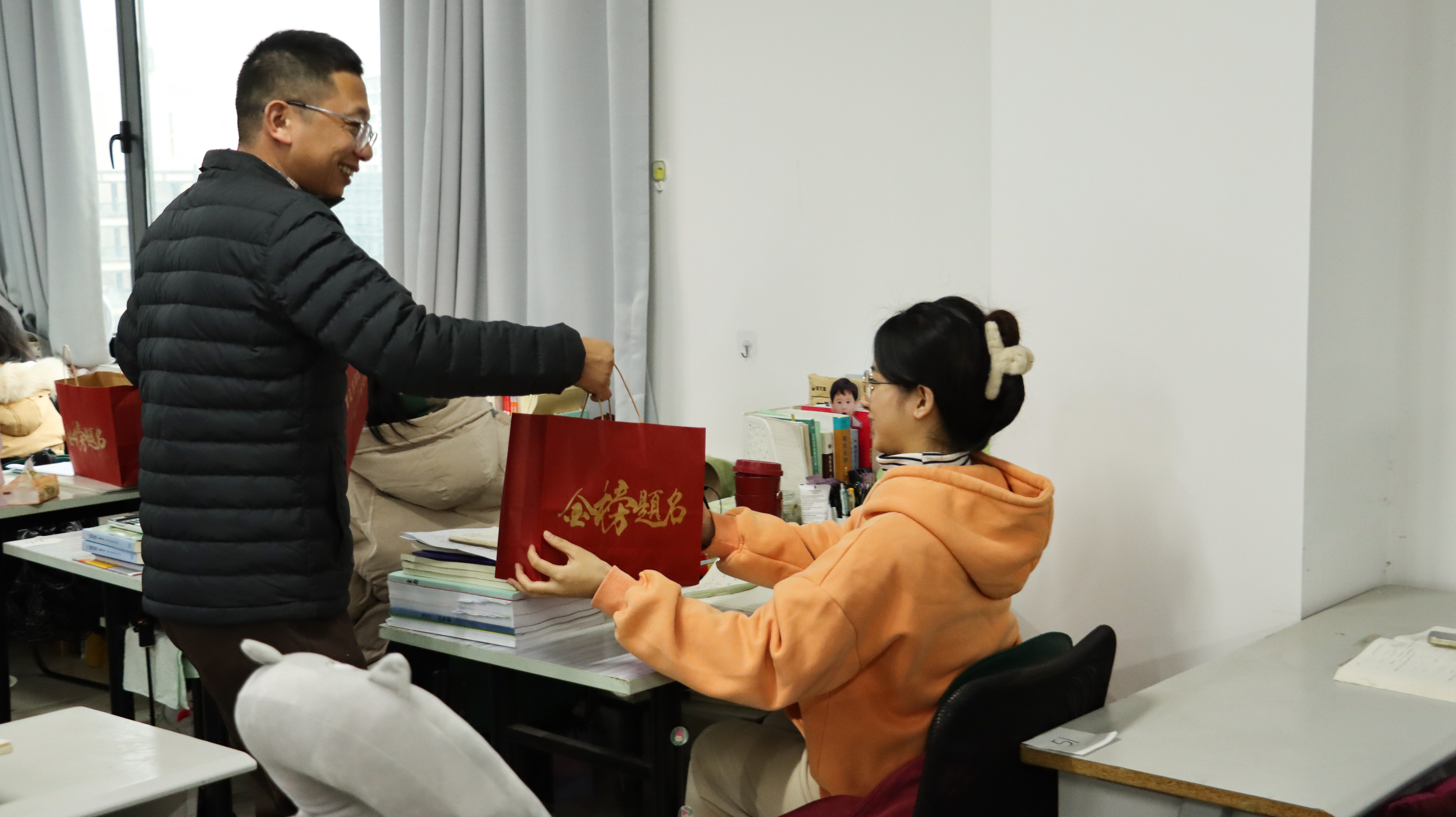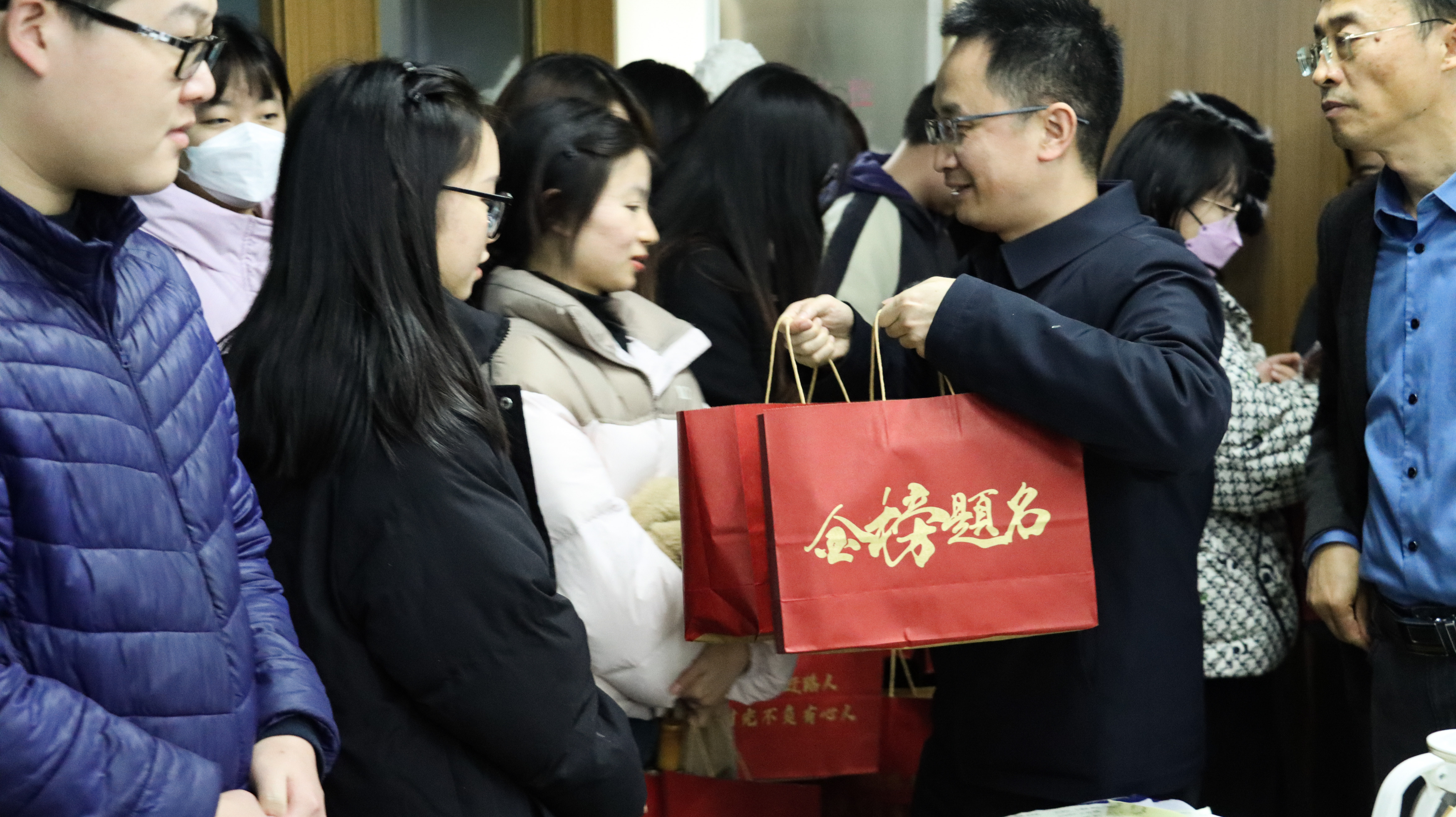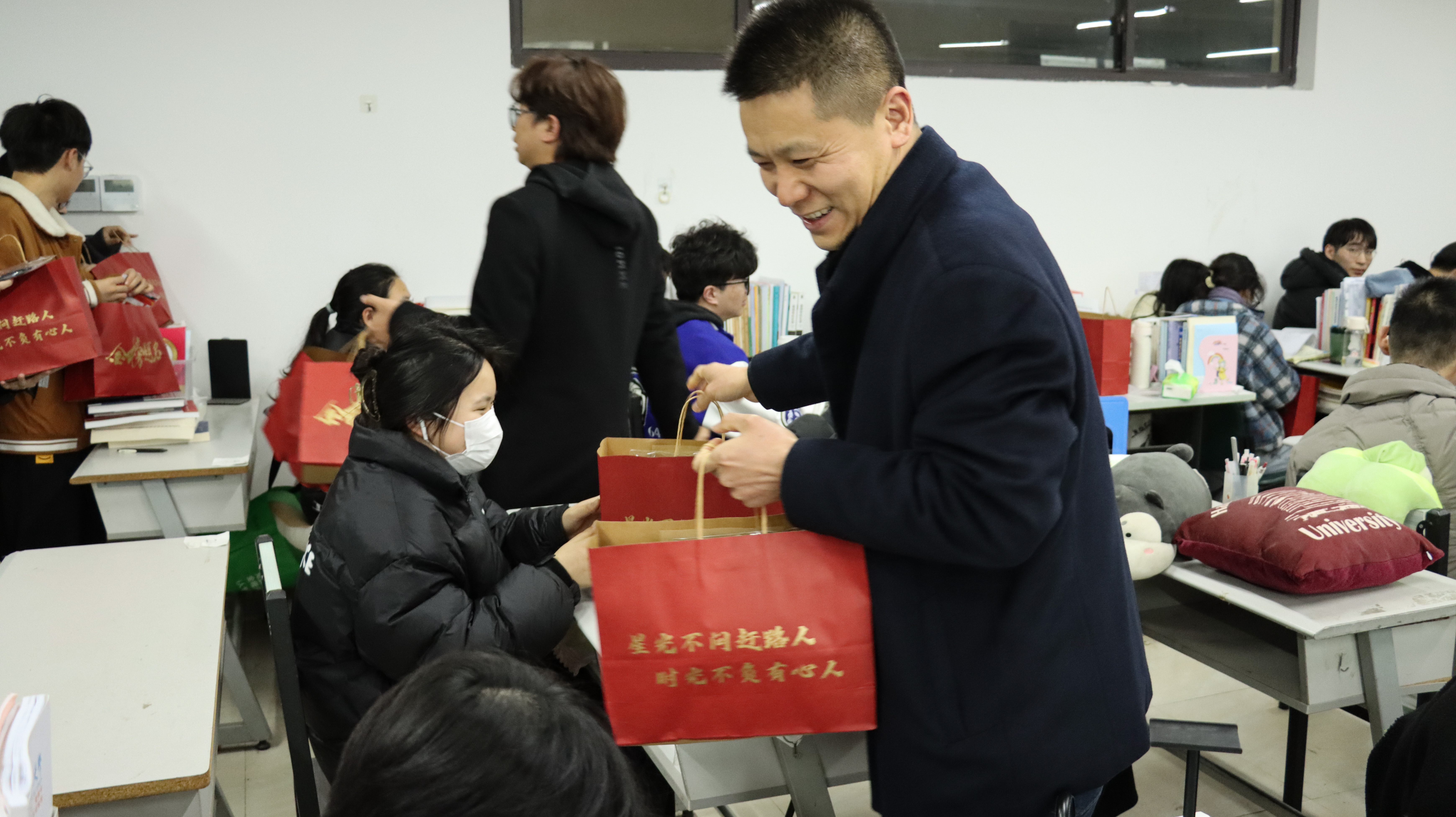 慰问现场,各位老师还与同学们交谈备考体会,传授考试经验,送上“金榜题名”暖心礼包。礼包中的每一个物品都经过了认真筛选与精心设计,不仅有寓意满满的“‘研’气十足”文具袋和“旺气满满”旺仔牛奶,还印有师长们的亲切寄语“星光不问赶路人,时光不负有心人”。小小的物品饱含了重庆时时彩 对考研学子们浓浓关爱和真切祝福,希望考研学子平安如意,发挥出最佳水平!