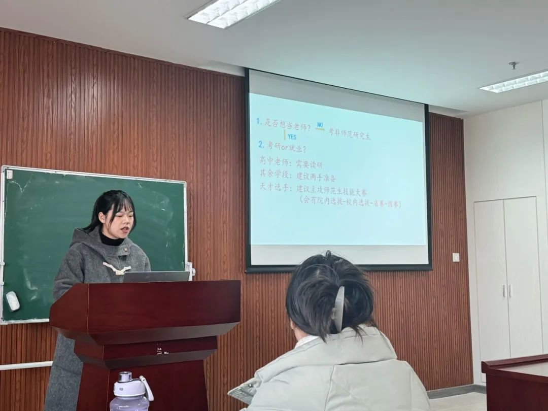 罗科洁从如何抉择、如何努力、如何应试、三个角度展开分享。在谈到如何选择考研和就业时,罗科洁首先询问同学们是否想成为一名老师,并且基于大环境向同学们介绍成为各个学段老师必须具备的素养。她建议同学们做好两手准备,并且列出了招聘和考研的具体时间,帮助同学们规划好本科的最后一年。