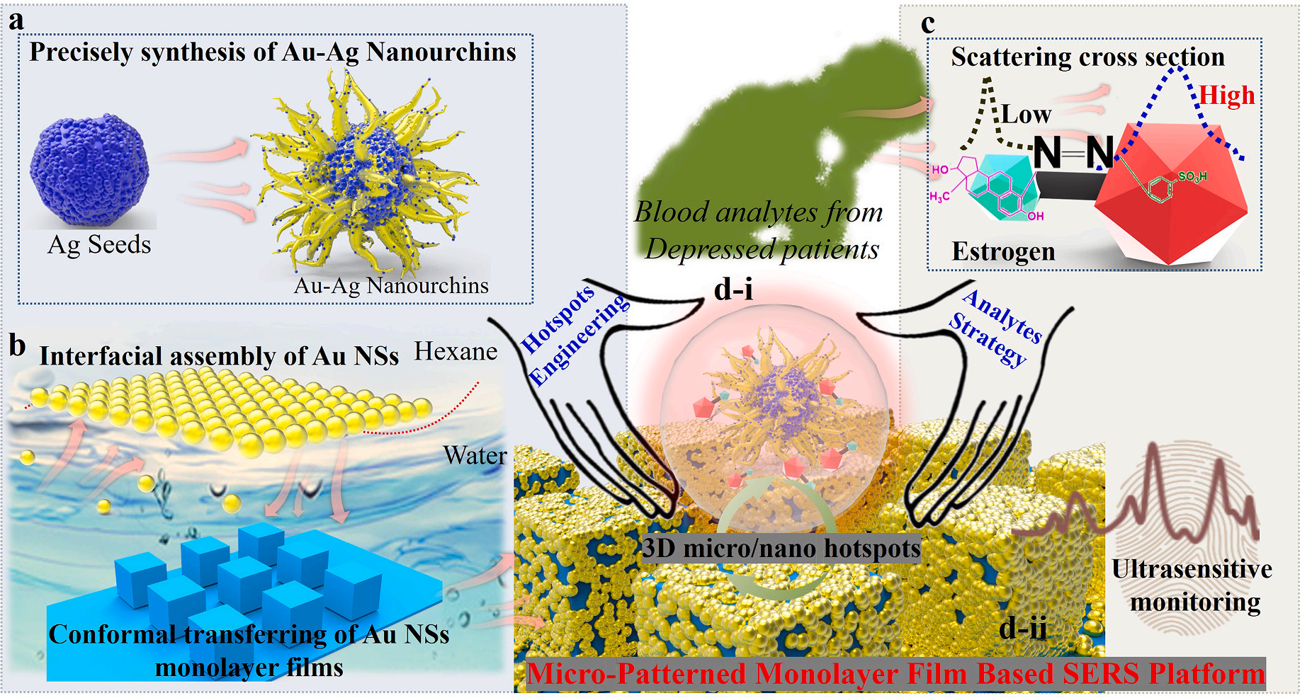 表面增强拉曼散射光谱(SERS)由于其单分指纹识别能力,在食品、人体健康及环境检测/监测中应用广泛。因此,利用SERS光谱检测手段有望实现抑郁症标志物的高灵敏检测,从而突破传统医疗诊断难以精准快速评估抑郁症的技术瓶颈。然而,目前SERS检测技术应用于抑郁症标志物检测仍然存在三个挑战:(i)目前常见的抑郁症标志物如雌二醇(常见于青少年女性抑郁症患者)、皮质醇等散射截面低,难以实现对其灵敏分析。(ii)为了增强抑郁症标志物的散射信号,通常会采用等离子纳米材料。然而,抑郁症标志物和等离子纳米材料之间的低亲和力往往导致纳米材料产生的热点“低效”,难以实现真正意义上的信号增强。(iii)考虑到疾病特异性生物标志物的低生理浓度和不同生物基质中的大量干扰,对SERS平台的设计有更严格的要求。