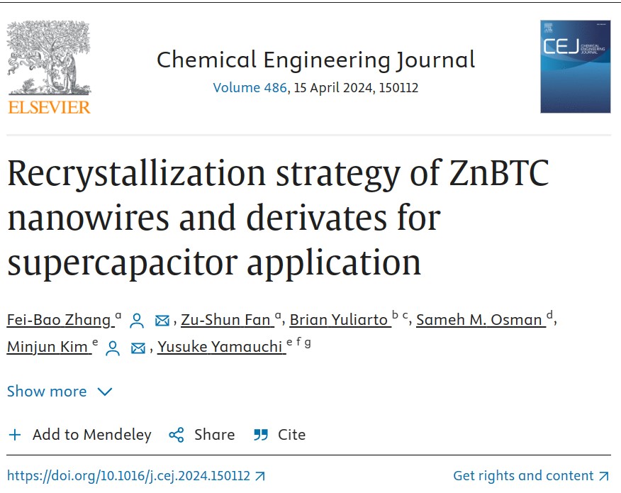近日,重庆时时彩 张飞豹副教授与 澳大利亚昆士兰大学Minjun Kim,Yusuke Yamauchi教授等在金属有机框架材料构建方面取得进展,研究成果以题为《Recrystallization strategy of ZnBTC nanowires and derivates for supercapacitor application》发表在Chemical Engineering Journal(Q1,IF = 15.1)上。